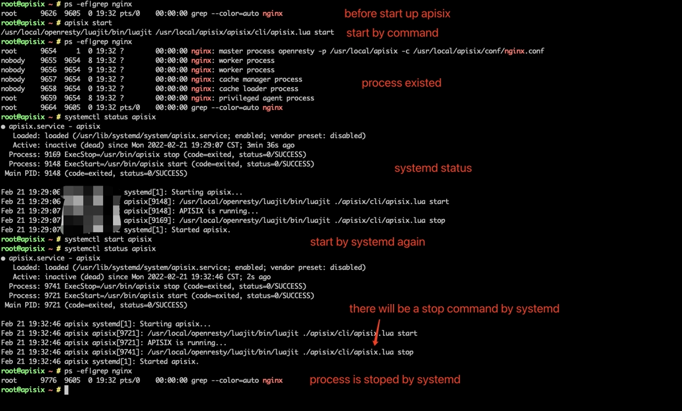 ### Issue description When apisix was started by the command 'apisix start', then using systemd to start apisix will cause the process to shut down. This may not be a bug exactily. But if in a production environment, one engineer starts process whth the former method, and another engineer uses systemd to execute the startup again, it may cause bad effects.  One way to avoid this problem is adding 'RemainAfterExit=yes' in apisix.service. ### Environment - apisix version (cmd: `apisix version`):2.12.1 - OS (cmd: `uname -a`): Linux apisix 3.10.0-514.26.2.el7.x86_64 #1 SMP Tue Jul 4 13:29:22 UTC 2017 x86_64 x86_64 x86_64 GNU/Linux - OpenResty / Nginx version (cmd: `nginx -V` or `openresty -V`):nginx version: openresty/1.19.9.1 - etcd version, if have (cmd: run `curl http://127.0.0.1:9090/v1/server_info` to get the info from server-info API):etcd-v3.5.1 - apisix-dashboard version, if have: - the plugin runner version, if the issue is about a plugin runner (cmd: depended on the kind of runner): - luarocks version, if the issue is about installation (cmd: `luarocks --version`): ### Steps to reproduce apisix start systemctl status apisix systemctl stop apisix systemctl status apisix ### Actual result Porcess shutdown ### Error log no need ### Expected result systemctl start apisix will not cause process shutdown -- This is an automated message from the Apache Git Service. To respond to the message, please log on to GitHub and use the URL above to go to the specific comment. To unsubscribe, e-mail: [email protected] For queries about this service, please contact Infrastructure at: [email protected]