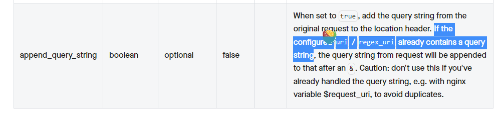 ### Issue description  The documentation says that query can be processed in regex_uri, how do I use it (when append_query_string is false) configure: regex_uri: ["(.*)/xxxxxx(.*)","https://xxxx.com/vvvvvvvvv$2$is_args$args"] error messageļ¼ {"error_msg":"failed to check the configuration of plugin redirect err: invalid regex_uri ((.*)\/xxxxxx(.*), https:\/\/xxxx.com\/vvvvvvvvv$2$is_args$args), err:failed to compile the replacement template"} ### Environment - apisix version (cmd: `apisix version`): 1.11.0 - OS (cmd: `uname -a`): centos7.9 - OpenResty / Nginx version (cmd: `nginx -V` or `openresty -V`):openresty/1.19.9.1 - etcd version, if have (cmd: run `curl http://127.0.0.1:9090/v1/server_info` to get the info from server-info API): - apisix-dashboard version, if have: - the plugin runner version, if the issue is about a plugin runner (cmd: depended on the kind of runner): - luarocks version, if the issue is about installation (cmd: `luarocks --version`): -- This is an automated message from the Apache Git Service. To respond to the message, please log on to GitHub and use the URL above to go to the specific comment. To unsubscribe, e-mail: [email protected] For queries about this service, please contact Infrastructure at: [email protected]