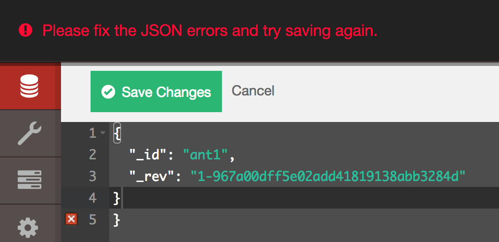 Antonio-Maranhao commented on issue #954: Save document does not prompt invalid JSON URL: https://github.com/apache/couchdb-fauxton/issues/954#issuecomment-333641366 The error message is displayed on the latest version in master using Firefox 56 (64bit) on Mac. Ctrl+S also triggers the save operation.  ---------------------------------------------------------------- This is an automated message from the Apache Git Service. To respond to the message, please log on GitHub and use the URL above to go to the specific comment. For queries about this service, please contact Infrastructure at: [email protected]
