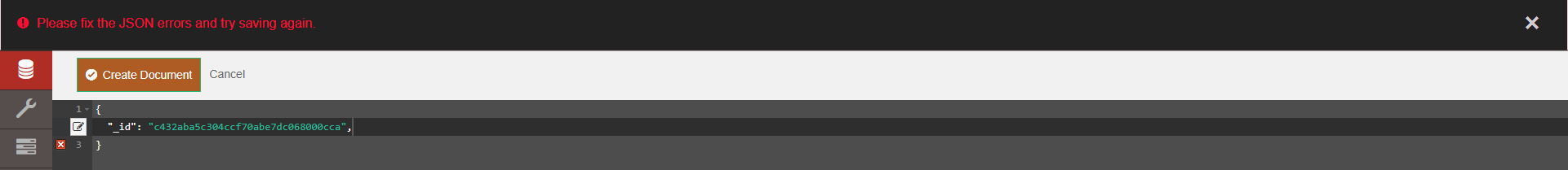 popojargo commented on issue #954: Save document does not prompt invalid JSON URL: https://github.com/apache/couchdb-fauxton/issues/954#issuecomment-394161994 This is fixed on the latest version of the master. The 2.1.1 build probably used an older tag of Fauxton. Proof:  @Antonio-Maranhao This should be closed.