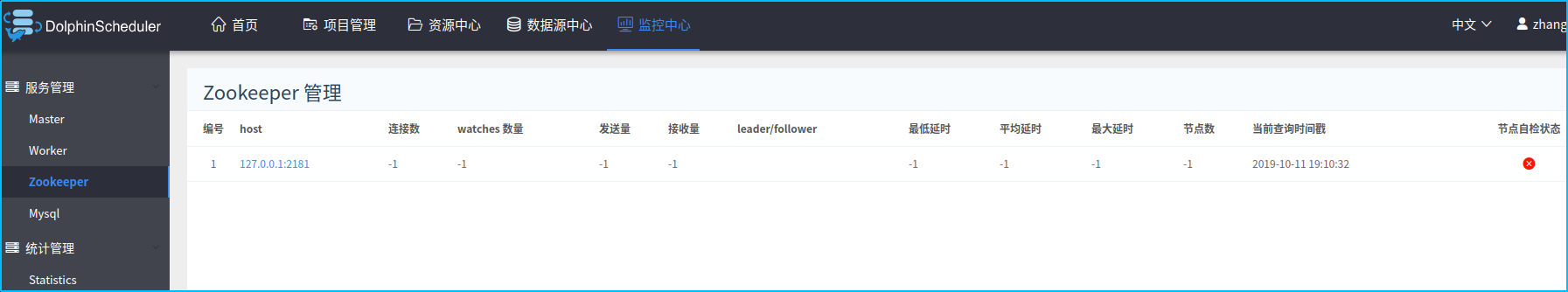 gary0416 opened a new issue #991: [BUG] zookeeper dashboard error URL: https://github.com/apache/incubator-dolphinscheduler/issues/991  Everything is -1. ``` root@34a2c3b68a9c:/opt/escheduler/logs# cat escheduler-api-server-34a2c3b68a9c.out . ____ _ __ _ _ /\\ / ___'_ __ _ _(_)_ __ __ _ \ \ \ \ ( ( )\___ | '_ | '_| | '_ \/ _` | \ \ \ \ \\/ ___)| |_)| | | | | || (_| | ) ) ) ) ' |____| .__|_| |_|_| |_\__, | / / / / =========|_|==============|___/=/_/_/_/ :: Spring Boot :: (v2.1.3.RELEASE) Exception in thread "FourLetterCmd:ruok" java.lang.NoClassDefFoundError: org/apache/logging/log4j/message/Message at org.apache.zookeeper.client.FourLetterWordMain.<clinit>(FourLetterWordMain.java:35) at cn.escheduler.api.utils.ZooKeeperState$SendThread.run(ZooKeeperState.java:135) Caused by: java.lang.ClassNotFoundException: org.apache.logging.log4j.message.Message at java.net.URLClassLoader.findClass(URLClassLoader.java:382) at java.lang.ClassLoader.loadClass(ClassLoader.java:424) at sun.misc.Launcher$AppClassLoader.loadClass(Launcher.java:349) at java.lang.ClassLoader.loadClass(ClassLoader.java:357) ... 2 more Exception in thread "FourLetterCmd:ruok" java.lang.NoClassDefFoundError: Could not initialize class org.apache.zookeeper.client.FourLetterWordMain at cn.escheduler.api.utils.ZooKeeperState$SendThread.run(ZooKeeperState.java:135) ``` **Which version of Easy Scheduler:** dev branch log4j jar is missing.