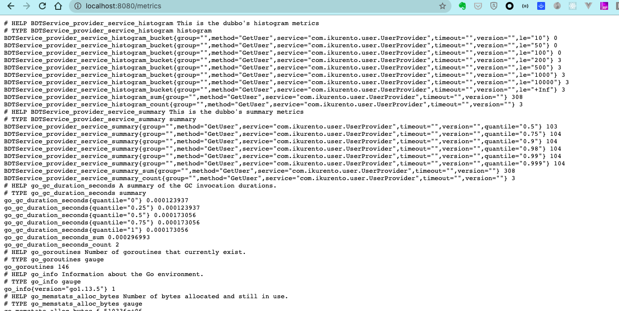 Prometheus samples : https://github.com/dubbogo/dubbo-samples/tree/master/golang/metric/dubbo Prometheus can connect to dubbo-go collect metric data.  ---------------------------------------------------------------- This is an automated message from the Apache Git Service. To respond to the message, please log on to GitHub and use the URL above to go to the specific comment. For queries about this service, please contact Infrastructure at: [email protected] --------------------------------------------------------------------- To unsubscribe, e-mail: [email protected] For additional commands, e-mail: [email protected]
