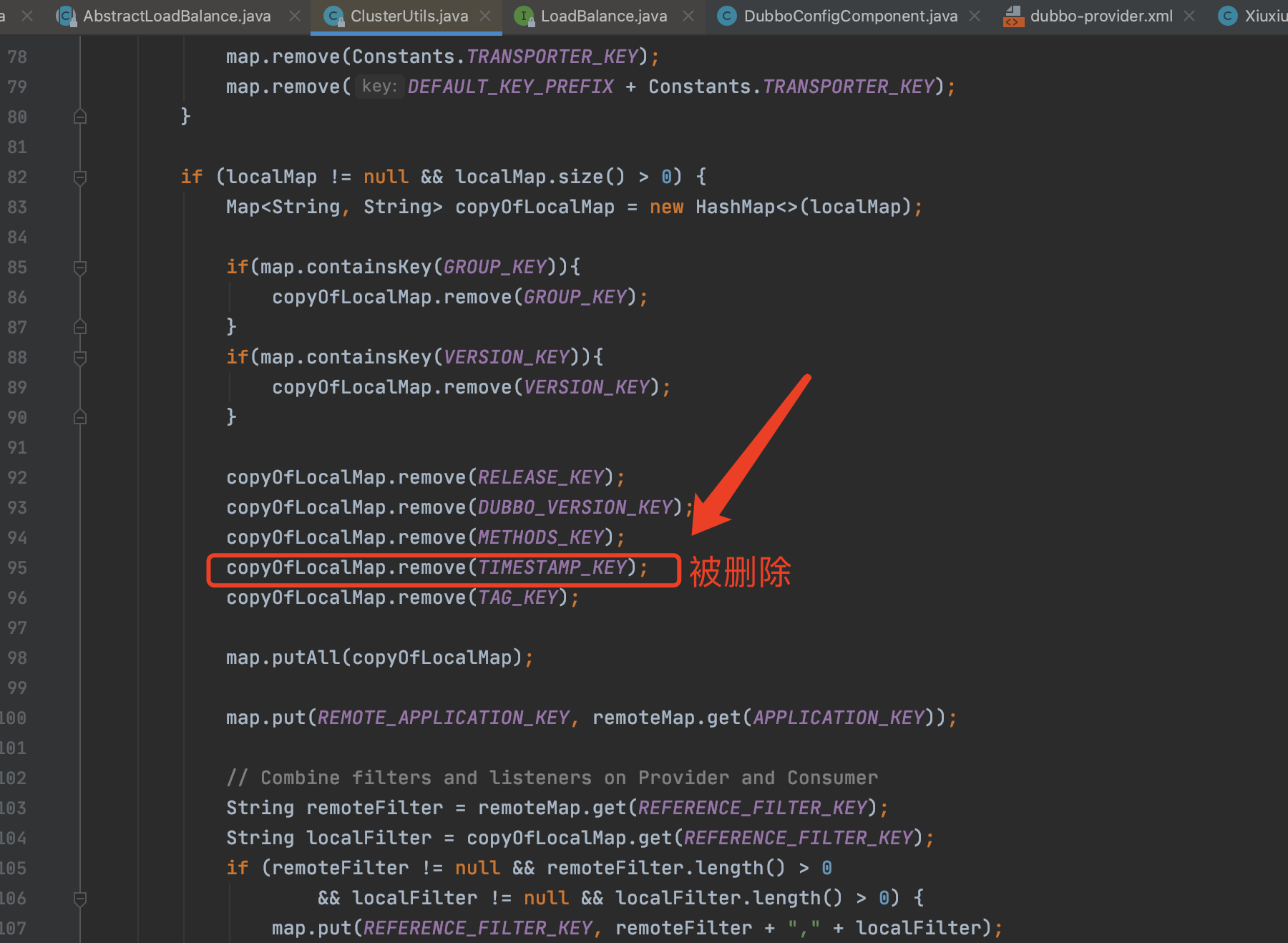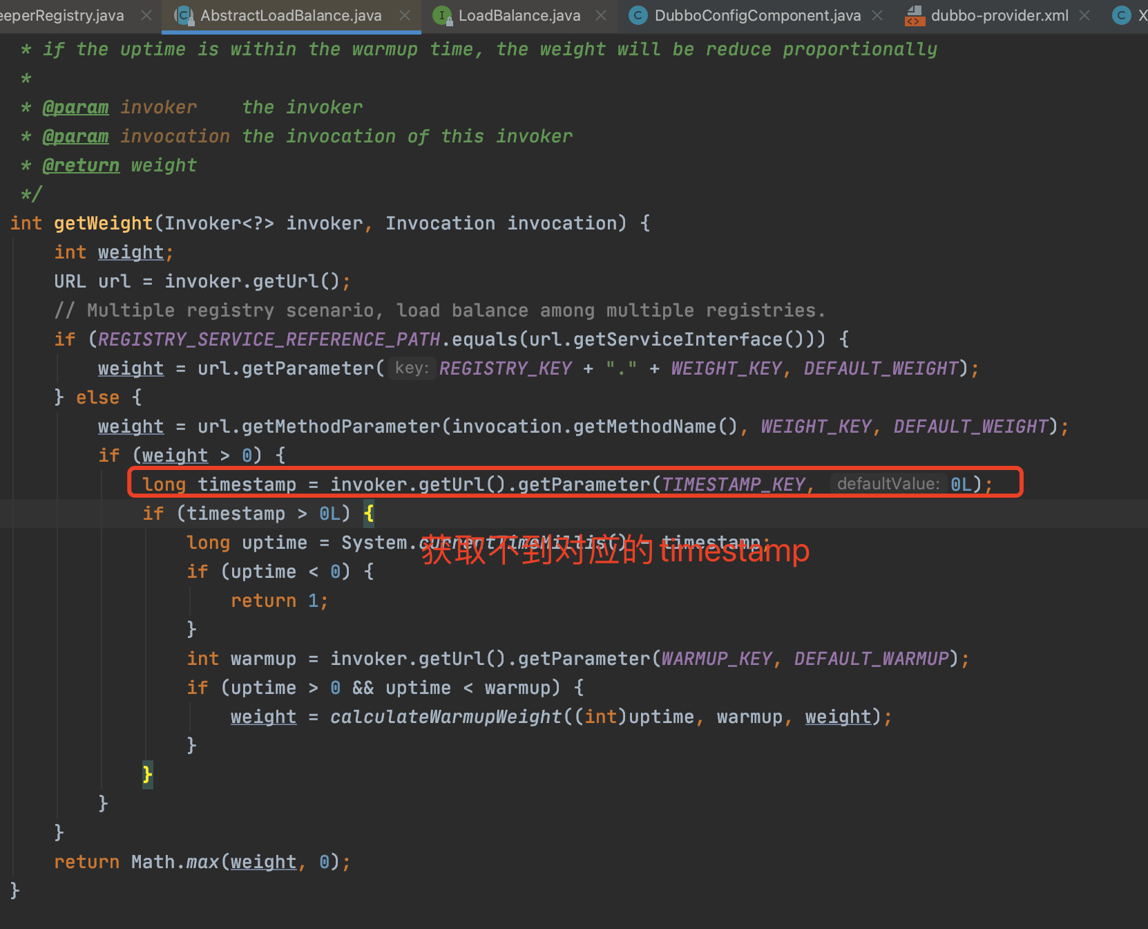 - [ ] I have searched the [issues](https://github.com/apache/dubbo/issues) of this repository and believe that this is not a duplicate. - [ ] I have checked the [FAQ](https://github.com/apache/dubbo/blob/master/FAQ.md) of this repository and believe that this is not a duplicate. ### Environment * Dubbo version: 2.7.6 * Java version: 1.8 负载均衡逻辑无法获取provider端timestamp是Dubbo 2.5.5一开始有问题,后面 Dubbo 2.5.6 又修复了,然后Dubbo 2.7.2代码调整完,又出问题了。最后文章说Dubbo 2.7.4 后完全修复了,但我看代码,在Dubbo 2.7.4 之后提交代码又有那个删provider 的 timestamp操作。   -- This is an automated message from the Apache Git Service. To respond to the message, please log on to GitHub and use the URL above to go to the specific comment. To unsubscribe, e-mail: [email protected] For queries about this service, please contact Infrastructure at: [email protected] --------------------------------------------------------------------- To unsubscribe, e-mail: [email protected] For additional commands, e-mail: [email protected]