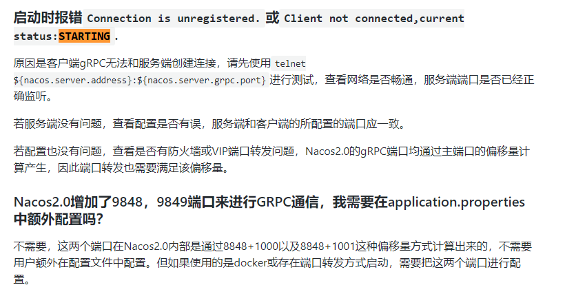 >  > > @sakka6868 sample 在我这边运行时正常的,我的 Nacos Server 是 2.0.1 版本的,请求 500 或者 401 可以去 nacos 社区看下有没有相关问题,或者是具体开启下 nacos 的详细日志(如果有)。  找到原因了😂nacos 2.0后用grpc通信,我的nacos是在容器里的,没有暴露那两个端口 -- This is an automated message from the Apache Git Service. To respond to the message, please log on to GitHub and use the URL above to go to the specific comment. To unsubscribe, e-mail: [email protected] For queries about this service, please contact Infrastructure at: [email protected] --------------------------------------------------------------------- To unsubscribe, e-mail: [email protected] For additional commands, e-mail: [email protected]