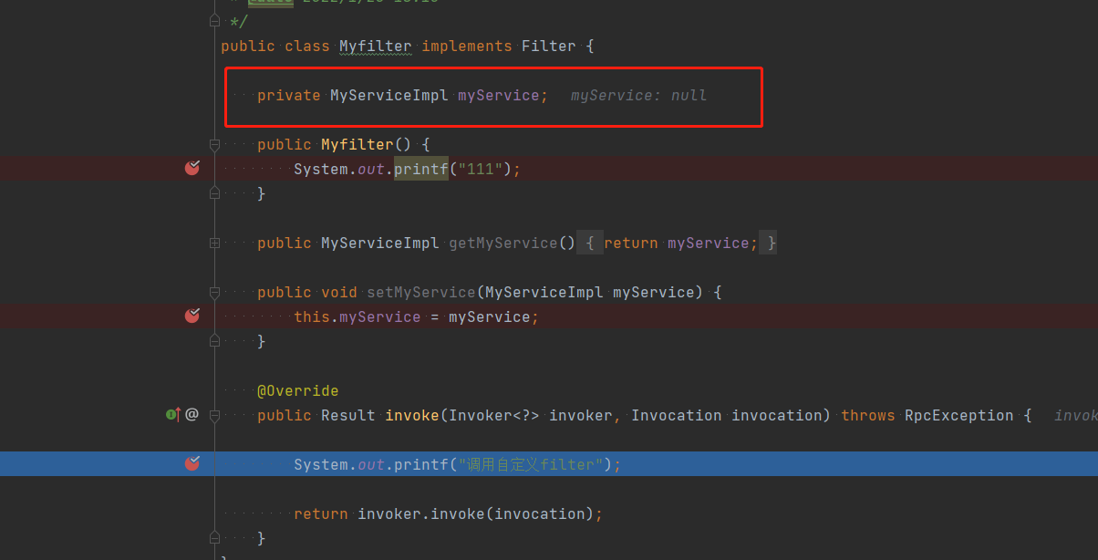 <!-- If you need to report a security issue please visit https://github.com/apache/dubbo/security/policy --> - [ ] I have searched the [issues](https://github.com/apache/dubbo/issues) of this repository and believe that this is not a duplicate. ### Environment * Dubbo version: master; last commitId:65bd70b54c87539ccc843b938479f0b7c2ea8d20 * Operating System version: win10 * Java version: 1.8 ### Steps to reproduce this issue 使用的是 dubbo-demo/dubbo-demo-xml/dubbo-demo-xml-consumer 1. 自定义Bean(MyServiceImpl)。xml注入spring容器 2. 自定义Myfilter实现 Filter;META-INF/debbo com.alibaba.dubbo.rpc.Filter(myfilter=org.apache.dubbo.demo.filter.Myfilter) 3. Myfilter 引用 MyServiceImpl,有set和get方法 4. dubbo-consumer.xml : <dubbo:reference id="demoService" check="false" interface="org.apache.dubbo.demo.DemoService" filter="myfilter"/> Pls. provide [GitHub address] to reproduce this issue. ### Expected Behavior 加载Myfilter,调用injectExtension(instance) -> SpringExtensionInjector 内的context 是null 无法完成IOC 注入 ### Actual Behavior <!-- What actually happens? --> If there is an exception, please attach the exception trace: ```  ``` -- This is an automated message from the Apache Git Service. To respond to the message, please log on to GitHub and use the URL above to go to the specific comment. To unsubscribe, e-mail: [email protected] For queries about this service, please contact Infrastructure at: [email protected] --------------------------------------------------------------------- To unsubscribe, e-mail: [email protected] For additional commands, e-mail: [email protected]