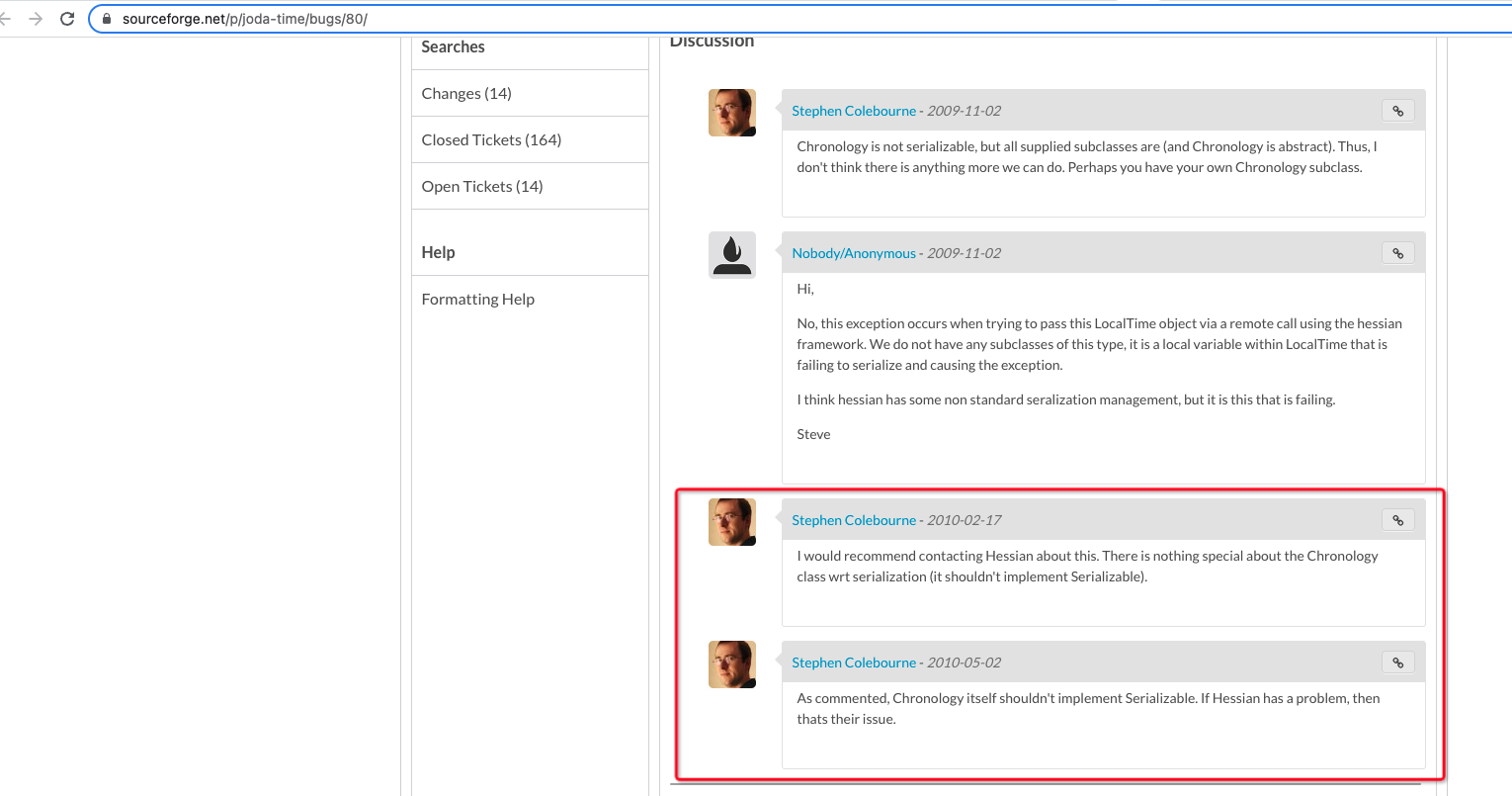 dubbo 遇到问题应该去哪里解决呢? jodatime的反序列化应该是个通用问题都没有搜索到答案,谁可以提供点信息呢? 难道没有人遇到同样的问题么? 相关报错记录,里面目前还没有说明解决方案 https://github.com/apache/dubbo/issues/126 https://github.com/apache/dubbo-hessian-lite/issues/6 Joda已经确定不是他们那边的问题 : http://sourceforge.net/p/joda-time/bugs/104/ http://sourceforge.net/p/joda-time/bugs/80/ 最近有人在修自定义序列化方式的问题 https://github.com/apache/dubbo/pull/9550/commits 目前获取支持的序列化方式只有4种 scopeModel.getExtensionLoader(type).getSupportedExtensions() compactedjava hessian2 java nativejava  -- This is an automated message from the Apache Git Service. To respond to the message, please log on to GitHub and use the URL above to go to the specific comment. To unsubscribe, e-mail: [email protected] For queries about this service, please contact Infrastructure at: [email protected] --------------------------------------------------------------------- To unsubscribe, e-mail: [email protected] For additional commands, e-mail: [email protected]