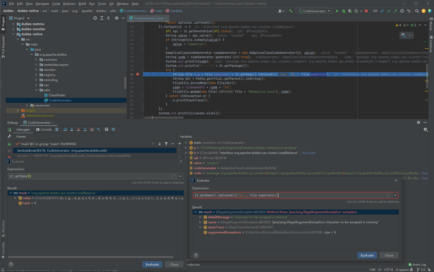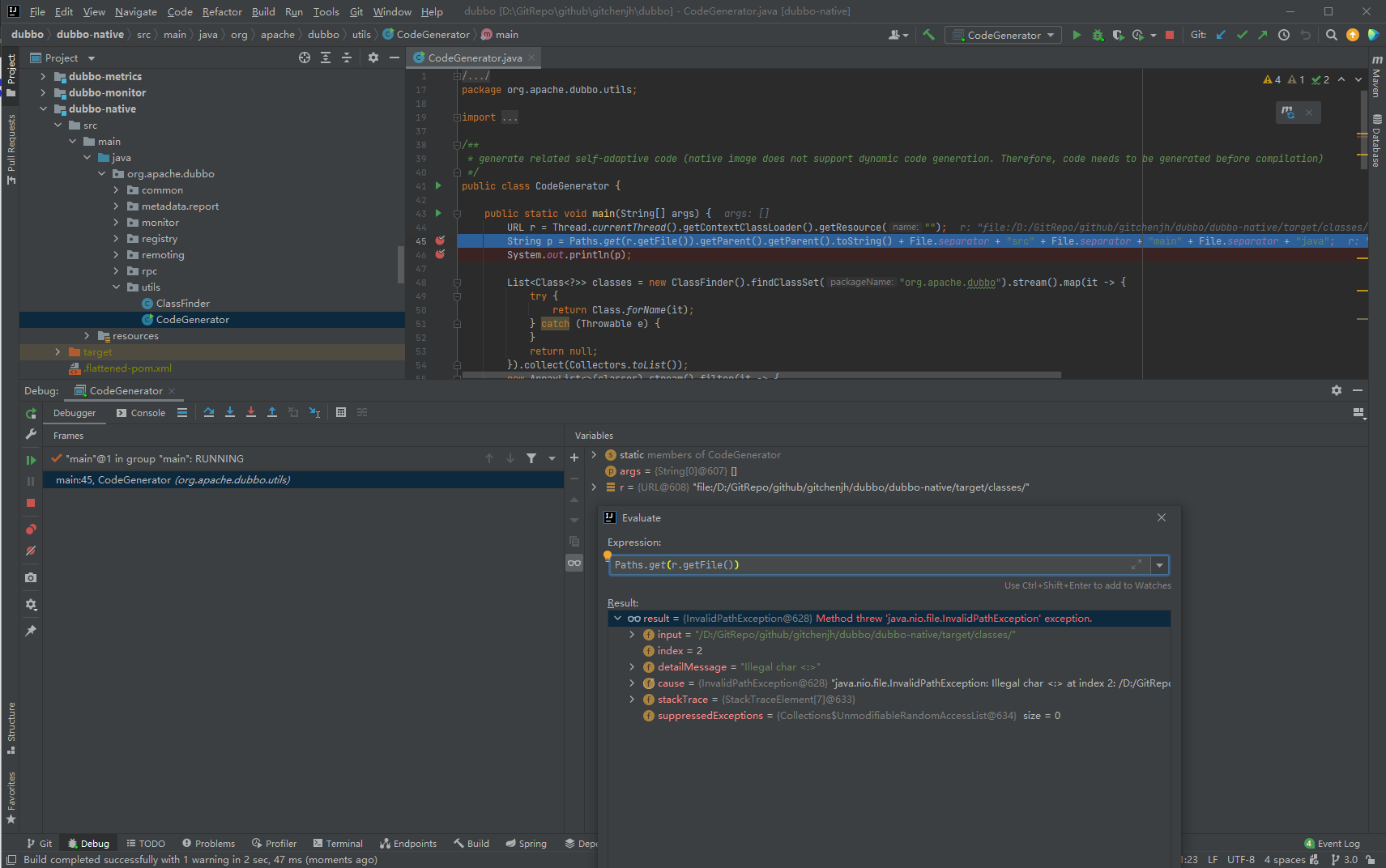 <!-- If you need to report a security issue please visit https://github.com/apache/dubbo/security/policy --> - [x] I have searched the [issues](https://github.com/apache/dubbo/issues) of this repository and believe that this is not a duplicate. ### Environment * Dubbo version: 3.0.7-SNAPSHOT * Operating System version: Windows 10 * Java version: 1.8 ### Steps to reproduce this issue 1. Build native-image demo flow the references : https://dubbo.apache.org/zh/docs/references/graalvm/support-graalvm/ 2. Run org.apache.dubbo.utils.CodeGenerator#man(String[] args) 3. It throws exception   -- This is an automated message from the Apache Git Service. To respond to the message, please log on to GitHub and use the URL above to go to the specific comment. To unsubscribe, e-mail: [email protected] For queries about this service, please contact Infrastructure at: [email protected] --------------------------------------------------------------------- To unsubscribe, e-mail: [email protected] For additional commands, e-mail: [email protected]