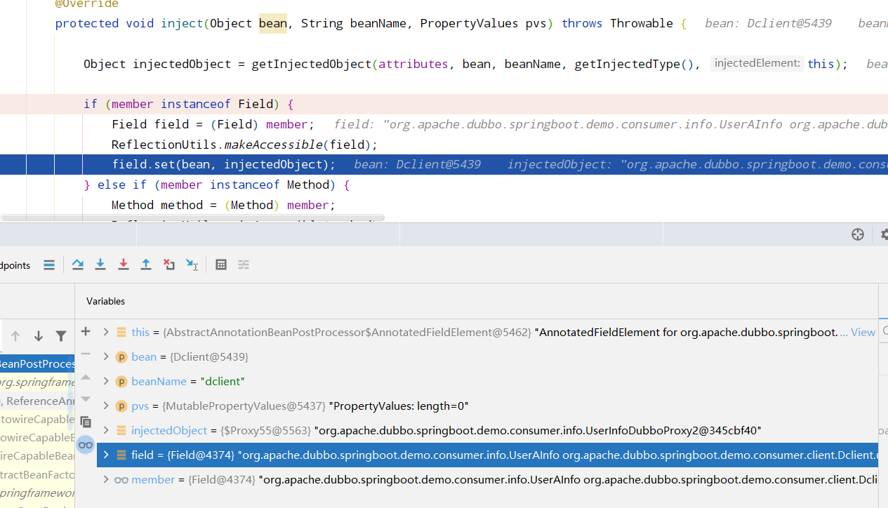 之后当前D类的 AnnotatedFieldElement的 injectedObject 值被设置为 userInfo#3