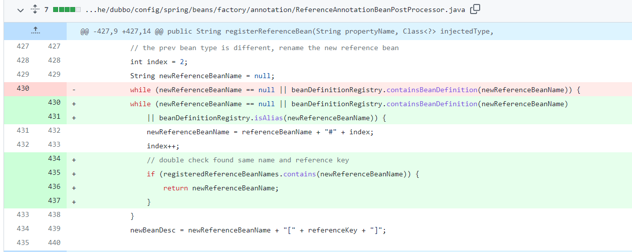> BCD三个类在注入依赖bean的时候,因为这三的属性名称一样且类型不一样(会走入你前面截图的逻辑里),按理注入的beanName应该分别为userInfo、userInfo#2、userInfo#3。我理解应该不会出现你所描述的 `beanDefinitionRegistry没有找到已经注册的bean`,我本地试了下没有问题,方便的话可以发一下你的demo我本地复现一下。 所以在此处  对newReferenceBeanName的要求应该是 没有被注册到 beanDefinitionRegistry中 且 别名中也没注册过当前名称,在生成新的newReferenceBeanName名称时 应该二次检查之前是否已经使用当前名称注册过,避免重复的注入多个别名 -- This is an automated message from the Apache Git Service. To respond to the message, please log on to GitHub and use the URL above to go to the specific comment. To unsubscribe, e-mail: [email protected] For queries about this service, please contact Infrastructure at: [email protected] --------------------------------------------------------------------- To unsubscribe, e-mail: [email protected] For additional commands, e-mail: [email protected]