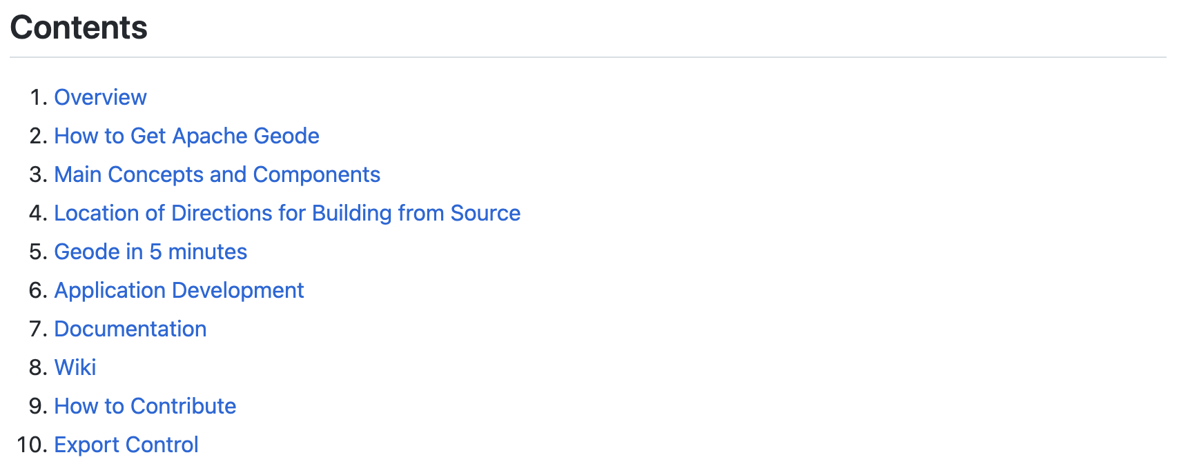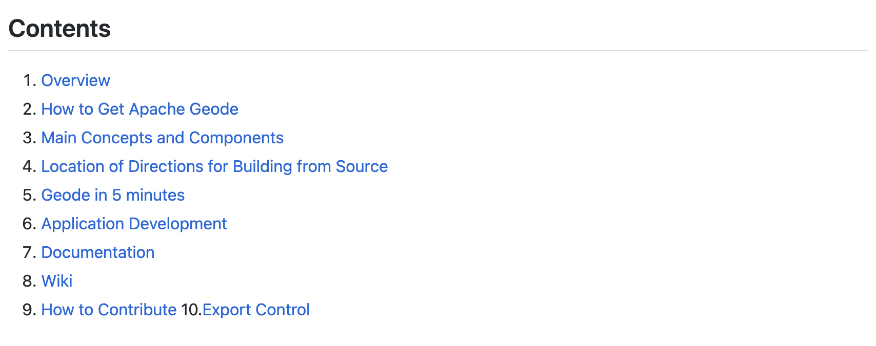<!-- Thank you for submitting a contribution to Apache Geode. --> <!-- In order to streamline the review of the contribution we ask you to ensure the following steps have been taken: --> Came here from ApacheCon, saw this and thought I'll start my contributions here 😄 This PR adds changes to format the contents section of the README in a way that the 9th and 10th list element are not rendered on to the same line. I've also changed the numbering from 1,2,3,4 to 1,1,1,1 so that Markdown can figure out the numbering (lesser chance of missing a number in the list) Before:  After:  ### For all changes: - [ ] Is there a JIRA ticket associated with this PR? Is it referenced in the commit message? - [x] Has your PR been rebased against the latest commit within the target branch (typically `develop`)? - [x] Is your initial contribution a single, squashed commit? - [x] Does `gradlew build` run cleanly? - [x] Have you written or updated unit tests to verify your changes? - [x] If adding new dependencies to the code, are these dependencies licensed in a way that is compatible for inclusion under [ASF 2.0](http://www.apache.org/legal/resolved.html#category-a)? <!-- Note: Please ensure that once the PR is submitted, check Concourse for build issues and submit an update to your PR as soon as possible. If you need help, please send an email to [email protected]. --> -- This is an automated message from the Apache Git Service. To respond to the message, please log on to GitHub and use the URL above to go to the specific comment. To unsubscribe, e-mail: [email protected] For queries about this service, please contact Infrastructure at: [email protected]