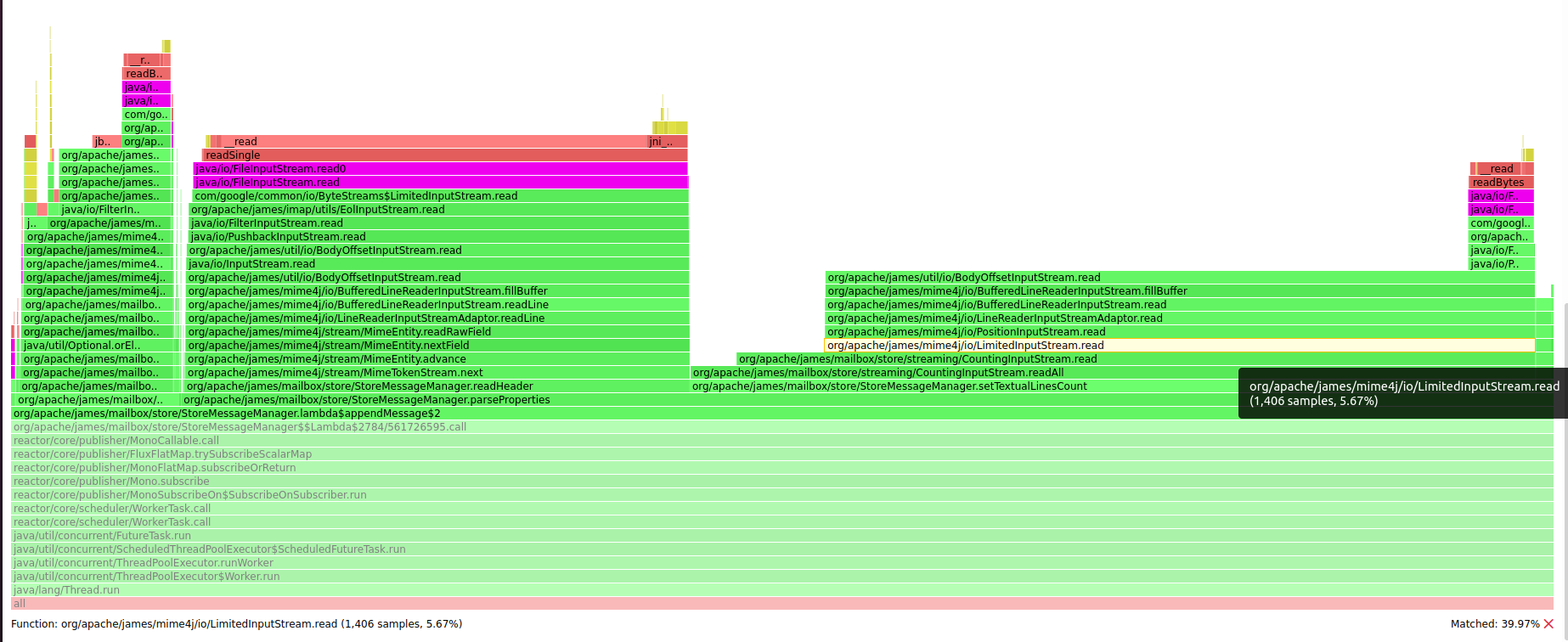 This lead to many calls to FileInputStream::read that triggers to much blocking calls. Before:  After:  -- This is an automated message from the Apache Git Service. To respond to the message, please log on to GitHub and use the URL above to go to the specific comment. For queries about this service, please contact Infrastructure at: [email protected] --------------------------------------------------------------------- To unsubscribe, e-mail: [email protected] For additional commands, e-mail: [email protected]