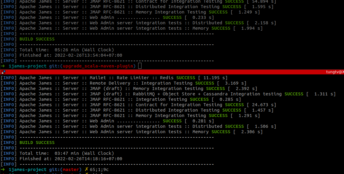 When running maven (`mvn clean install`), The new version of scala maven plugin (v4.5.6) take more time than older version we used before (v.3.4.6) (https://github.com/apache/james-project/pull/826/commits/c2288511de79d1282081f39aba34e23213041317) It comes from `incremental compilation` (https://davidb.github.io/scala-maven-plugin/example_incremental.html) "The incremental compilation is enabled by default after scala-maven-plugin v4.0.0, and the "recompileMode" configuration option is set to "incremental" by default." => Change suggestion: `<recompileMode>incremental</recompileMode>` -> `<recompileMode>all</recompileMode>` ### Result - Command: `mvn clean install -Dmaven.javadoc.skip=true -DskipTests -T11` - Env 1: My PC - CPU AMD 5600G - 6 core 12 threads - Before: Total time: 05:26 min (Wall Clock) - After: Total time: 03:47 min (Wall Clock) - - Env 2: My Laptop - CPU Intel 8250u - 4 core 8 thread - Before: Total time: 12:09 min (Wall Clock) - After: Total time: 08:28 min (Wall Clock)  -- This is an automated message from the Apache Git Service. To respond to the message, please log on to GitHub and use the URL above to go to the specific comment. To unsubscribe, e-mail: [email protected] For queries about this service, please contact Infrastructure at: [email protected] --------------------------------------------------------------------- To unsubscribe, e-mail: [email protected] For additional commands, e-mail: [email protected]