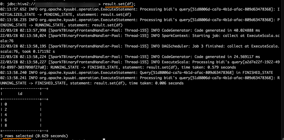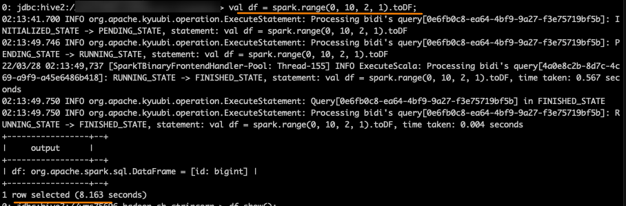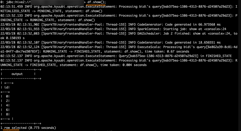 ## Test script ```sql set kyuubi.operation.language=scala; val df = spark.range(0, 10, 2, 1).toDF; df.show(); result.set(df); ``` ## Current    ## Fix    -- This is an automated message from the Apache Git Service. To respond to the message, please log on to GitHub and use the URL above to go to the specific comment. To unsubscribe, e-mail: [email protected] For queries about this service, please contact Infrastructure at: [email protected] --------------------------------------------------------------------- To unsubscribe, e-mail: [email protected] For additional commands, e-mail: [email protected]