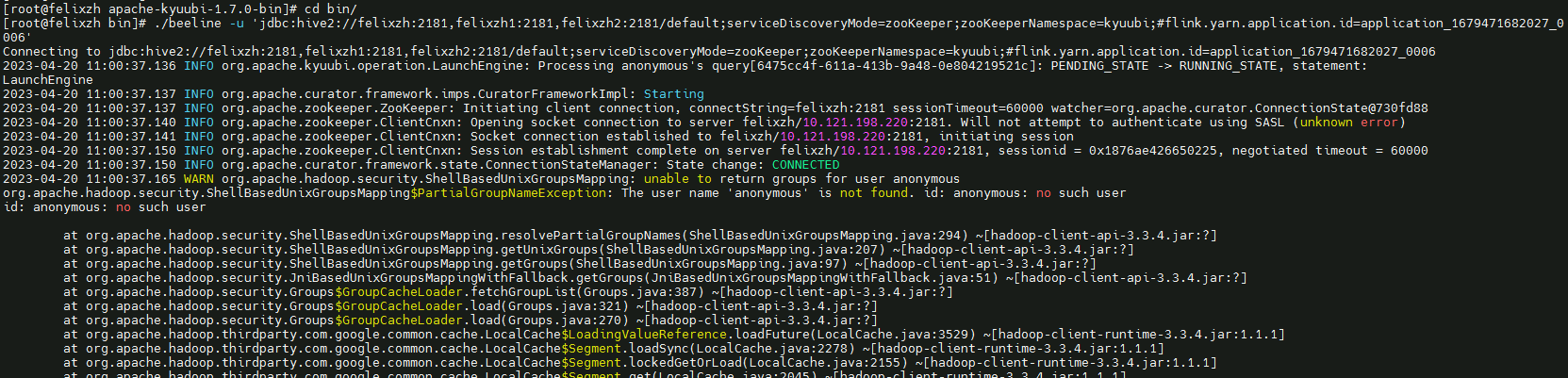 ### Code of Conduct - [X] I agree to follow this project's [Code of Conduct](https://www.apache.org/foundation/policies/conduct) ### Search before asking - [X] I have searched in the [issues](https://github.com/apache/kyuubi/issues?q=is%3Aissue) and found no similar issues. ### Describe the bug run cmd: ./beeline -u 'jdbc:hive2://felixzh:2181,felixzh1:2181,felixzh2:2181/default;serviceDiscoveryMode=zooKeeper;zooKeeperNamespace=kyuubi;#flink.yarn.application.id=application_1679471682027_0006' shell exception:  ### Affects Version(s) 1.7.0 ### Kyuubi Server Log Output _No response_ ### Kyuubi Engine Log Output _No response_ ### Kyuubi Server Configurations _No response_ ### Kyuubi Engine Configurations _No response_ ### Additional context _No response_ ### Are you willing to submit PR? - [X] Yes. I would be willing to submit a PR with guidance from the Kyuubi community to fix. - [ ] No. I cannot submit a PR at this time. -- This is an automated message from the Apache Git Service. To respond to the message, please log on to GitHub and use the URL above to go to the specific comment. To unsubscribe, e-mail: [email protected] For queries about this service, please contact Infrastructure at: [email protected] --------------------------------------------------------------------- To unsubscribe, e-mail: [email protected] For additional commands, e-mail: [email protected]