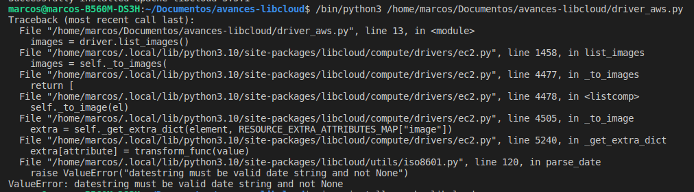 ## Summary It seems to be an error querying a datestring from extra data of the images of EC2 ## Detailed Information I'm newbie at using libcloud, i've already ran a file to list the images of GCP Compute Engine - not problem. Then, i tried to do the same but using AWS EC2, and i'm pretty sure that there are not problems with ACCESS_ID an SECRET_KEY, since i tried to modify these in order to damage the keys and then it appears an error with AWS AuthFailure, but when i use the correct ones, there's no problem around there. But when trying to print the list of images, i got the error ValueError: datestring must be valid date string and not None. This includes information about your environment (which Libcloud version are you using, which Python version, which Operating System / distribution, etc.) and steps which are needed to reproduce it. I'm currently using Apache Libcloud 3.6.0, Python 3.10 and Ubuntu 22.04 If you need to check out my code, you can check this repo: https://github.com/juanmarcosdev/avances-libcloud/ The file driver_gcp.py works pretty well. The one with the error is driver_aws.py I'm using a .env file in order to keep secret my AWS credentials. Thanks!  -- This is an automated message from the Apache Git Service. To respond to the message, please log on to GitHub and use the URL above to go to the specific comment. To unsubscribe, e-mail: [email protected] For queries about this service, please contact Infrastructure at: [email protected]