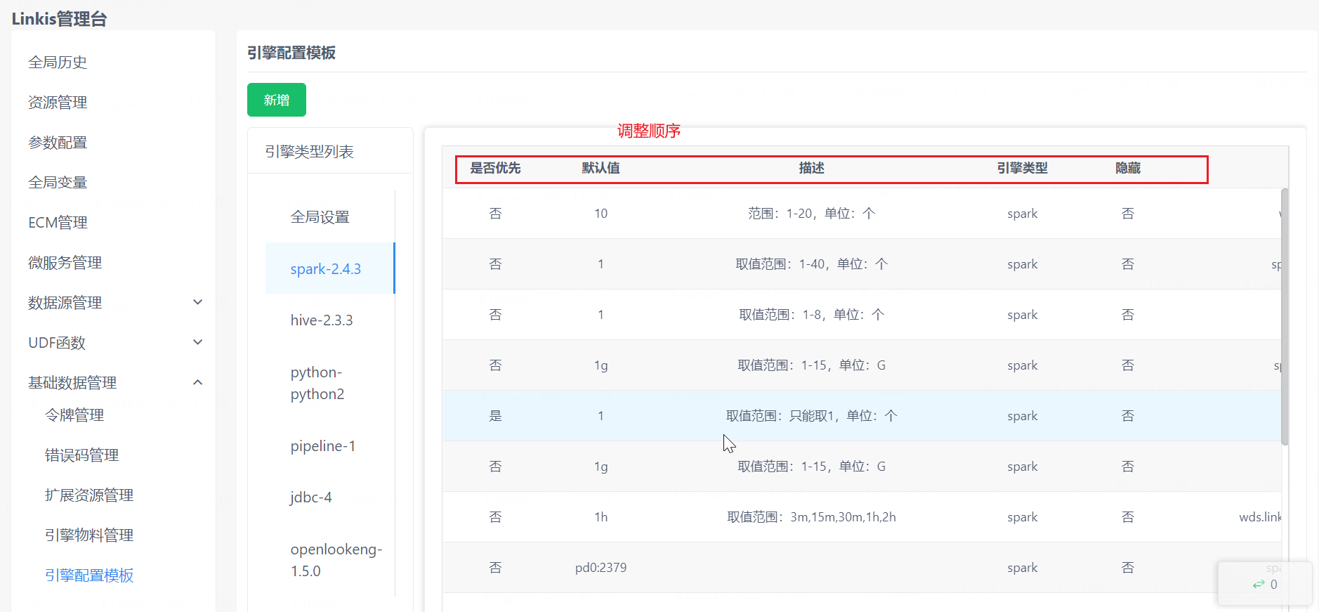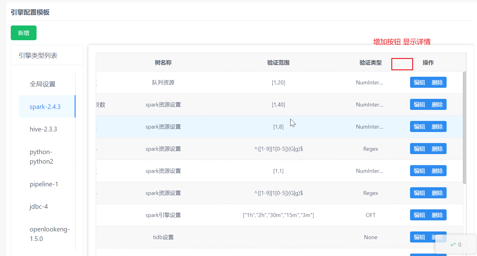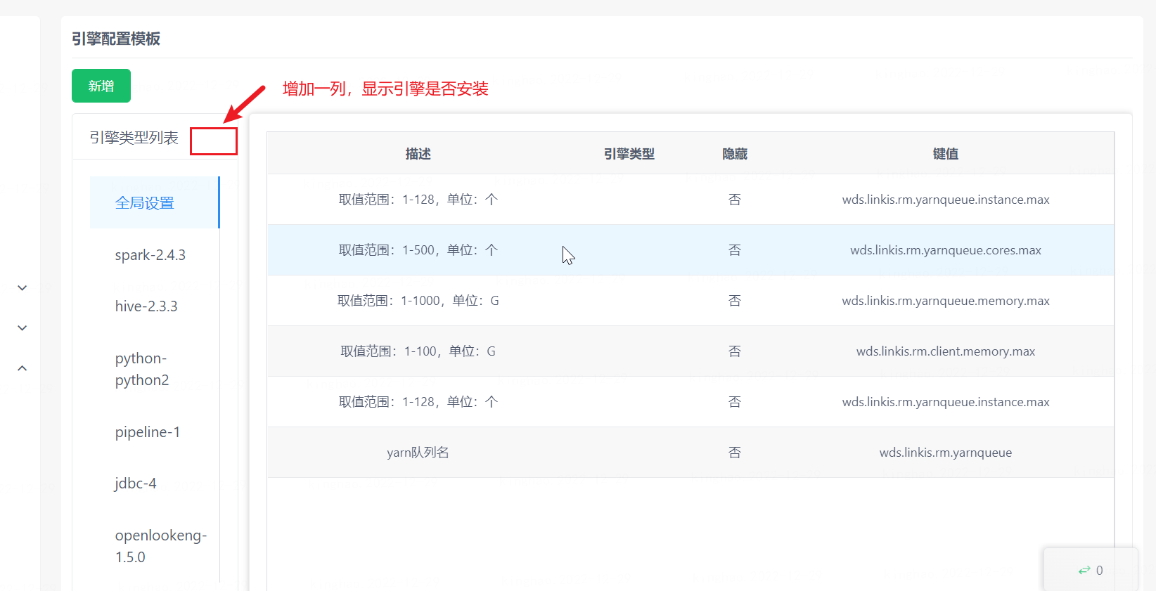 ### Search before asking - [X] I searched the [issues](https://github.com/apache/incubator-linkis/issues) and found no similar issues. ### Linkis Component linkis-web ### Steps to reproduce 一、页面显示调整 1.修改显示顺序 名称 键值 默认值 引擎类型 验证范围 验证类型 描述 操作  2.建议隐藏列(增加显示详情按钮,点击后显示全部) 隐藏列:是否优先 隐藏 等级 树名称  3.引擎类型列未显示数据  4.左侧引擎类型列表建议增加一列,用于区分引擎是否安装  5.新增页面,引擎类型ID 改为 引擎类型  6.新增页面,调整表单顺序:引擎类型 名称 键值(这个目前未显示) 默认值 描述 是否优先 隐藏 等级 验证范围 验证类型 树名称  二、页面bug 1.点击新增,弹框页面显示的是"修改"  2.新增键值失败   3.编辑失败   ### Expected behavior 正确显示 ### Your environment linkis-web ### Anything else _No response_ ### Are you willing to submit a PR? - [ ] Yes I am willing to submit a PR! -- This is an automated message from the Apache Git Service. To respond to the message, please log on to GitHub and use the URL above to go to the specific comment. To unsubscribe, e-mail: [email protected] For queries about this service, please contact Infrastructure at: [email protected] --------------------------------------------------------------------- To unsubscribe, e-mail: [email protected] For additional commands, e-mail: [email protected]