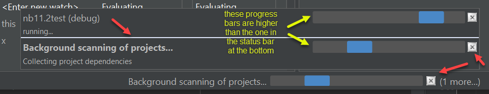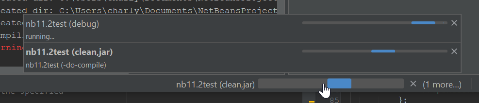 DevCharly opened a new pull request #1884: [NETBEANS-3713] FlatLaf: progress bar improvements URL: https://github.com/apache/netbeans/pull/1884 - progress bar in status bar now always has large height (has changed height before depending on whether text is painted in progress bar) - cancel button replaced with vector icon - fixed color of separator in "Processes" popup - remove separator of last row in "Processes" popup if process was removed - use preferred height for progress bars in "Processes" popup Before ("Processes" popup shown):  Before, separator was not removed after background scanning finished:  After:  "Processes" popup: