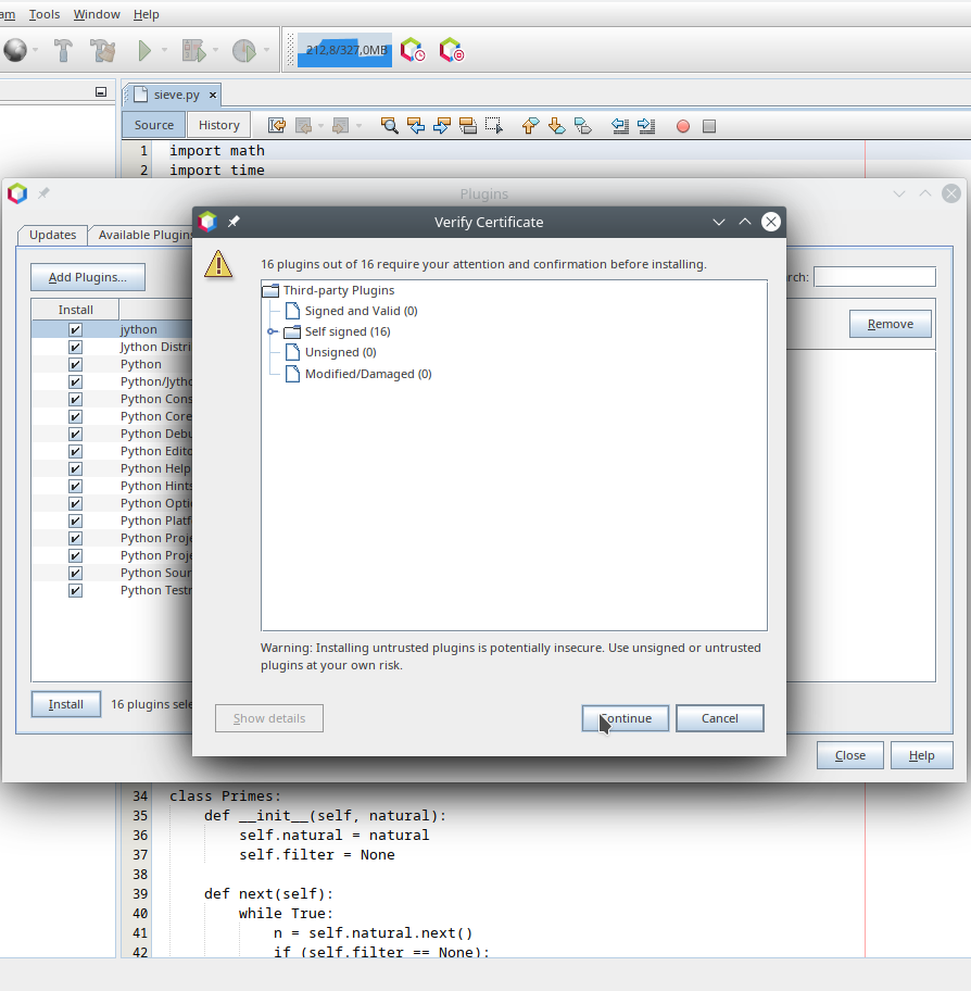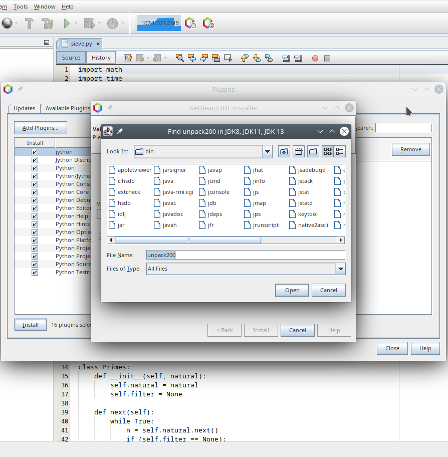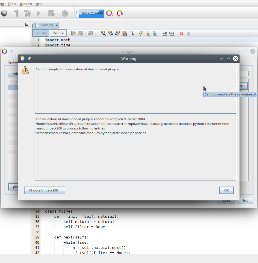 With the 473d461 change I can run on JDK14 and install the [python support](http://plugins.netbeans.org/plugin/61688/python). During validation we get a warning describing the missing `unpack200` problem:  We can open a file chooser and select an alternative `unpack200` executable. The system tries to find one in sibling JDKs assuming people have JDK14 next to other older JDKs:  Then the validation is restarted and continues with normal licensing checks:  in case of the python support a restart is needed. The upgrader picks the selected `unpack200` up and uses it to unpack the legacy NBMs:  The endeavor ends with support for Python files being ready in the editor:  ---------------------------------------------------------------- This is an automated message from the Apache Git Service. To respond to the message, please log on to GitHub and use the URL above to go to the specific comment. For queries about this service, please contact Infrastructure at: [email protected] --------------------------------------------------------------------- To unsubscribe, e-mail: [email protected] For additional commands, e-mail: [email protected] For further information about the NetBeans mailing lists, visit: https://cwiki.apache.org/confluence/display/NETBEANS/Mailing+lists