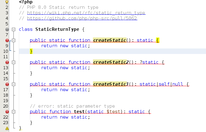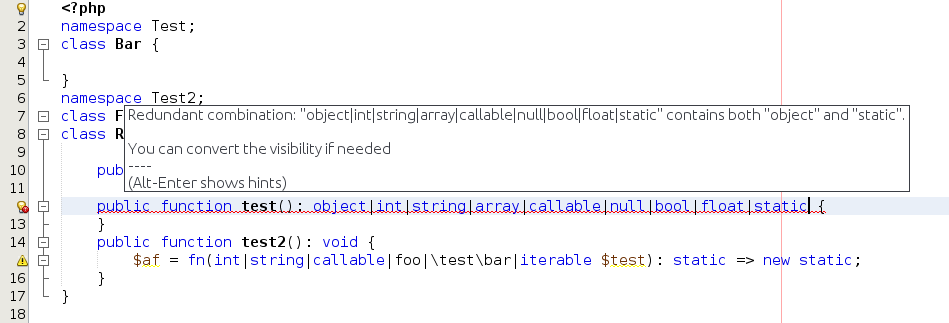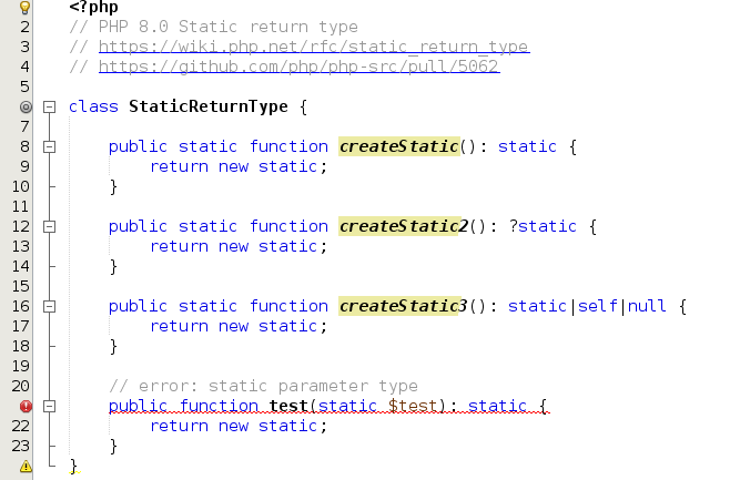 https://issues.apache.org/jira/browse/NETBEANS-4443 #### Part 1 - https://wiki.php.net/rfc/static_return_type - Fix the `ASTPHP5Parser.cup` - Fix the code completion feature - Add unit tests for the parser and the code completion ##### PHP 8.0 (Project Properties)  ##### PHP 7.4 (Project Properties)  #### Part 2 - Fix `IntroduceSuggestion` and `PHP80UnhandledError` - Fix `UnusableTypesUnhandledError` (Error for redundant combination with the object type) - Add unit tests for override/implement method, formatting, and the comment generator features ###### Error for redundant combination with the object type  ---------------------------------------------------------------- This is an automated message from the Apache Git Service. To respond to the message, please log on to GitHub and use the URL above to go to the specific comment. For queries about this service, please contact Infrastructure at: [email protected] --------------------------------------------------------------------- To unsubscribe, e-mail: [email protected] For additional commands, e-mail: [email protected] For further information about the NetBeans mailing lists, visit: https://cwiki.apache.org/confluence/display/NETBEANS/Mailing+lists