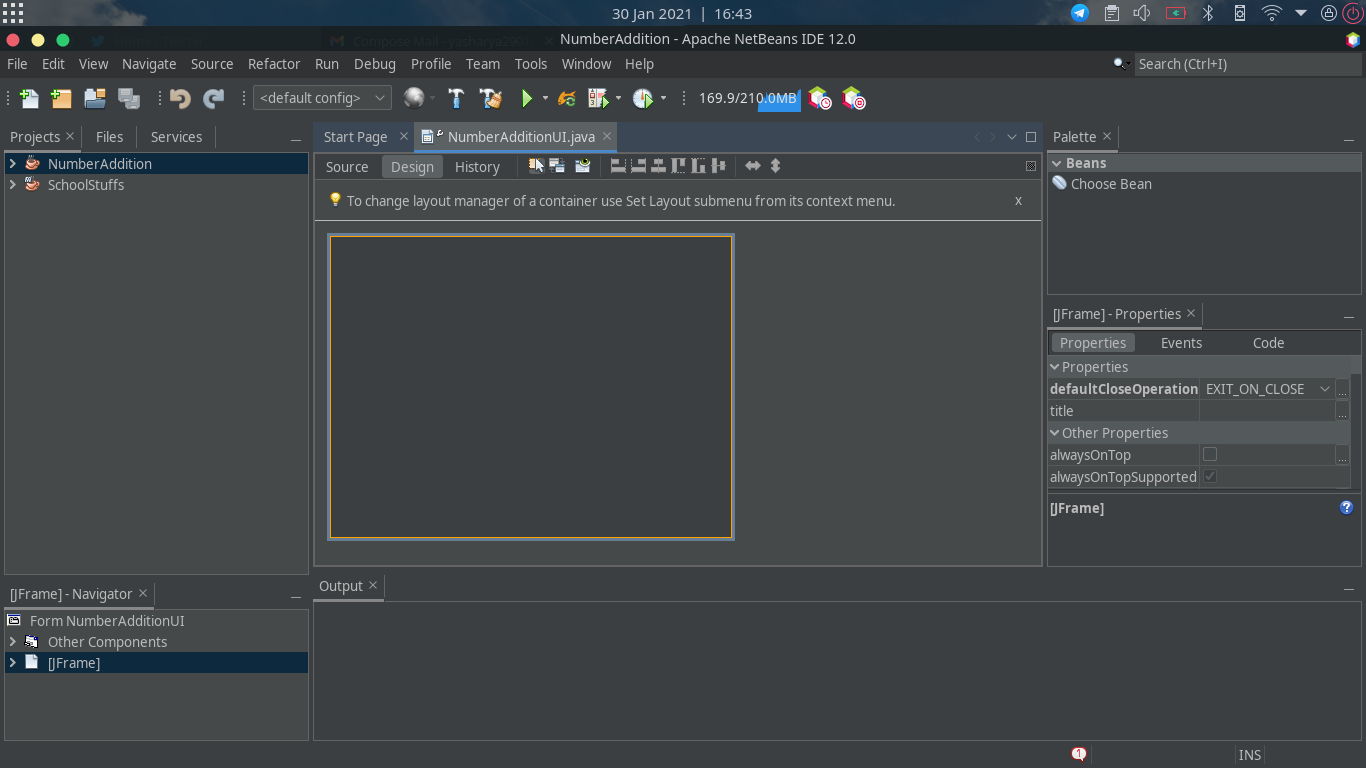 Hello, I am having some problems with Netbeans. I tried sending an email to [email protected] but couldn't send the email. It said email couldn't be sent to the given address. I didn't know where and who to ask and so I am writing it here. I am simply pasting the email I wrote here: I downloaded the Netbeans from the official sh script from the website in my latest KDE Neon operating system. Here's the text from the About option in my netbeans: Product Version: Apache NetBeans IDE 12.0 Java: 15.0.2; OpenJDK 64-Bit Server VM 15.0.2+7-27 Runtime: OpenJDK Runtime Environment 15.0.2+7-27 System: Linux version 5.4.0-65-generic running on amd64; UTF-8; en_IN (nb) In the screenshot I have attached, you can see that no Buttons or labels are visible to be dragged into the window. Please help!  ---------------------------------------------------------------- This is an automated message from the Apache Git Service. To respond to the message, please log on to GitHub and use the URL above to go to the specific comment. For queries about this service, please contact Infrastructure at: [email protected] --------------------------------------------------------------------- To unsubscribe, e-mail: [email protected] For additional commands, e-mail: [email protected] For further information about the NetBeans mailing lists, visit: https://cwiki.apache.org/confluence/display/NETBEANS/Mailing+lists