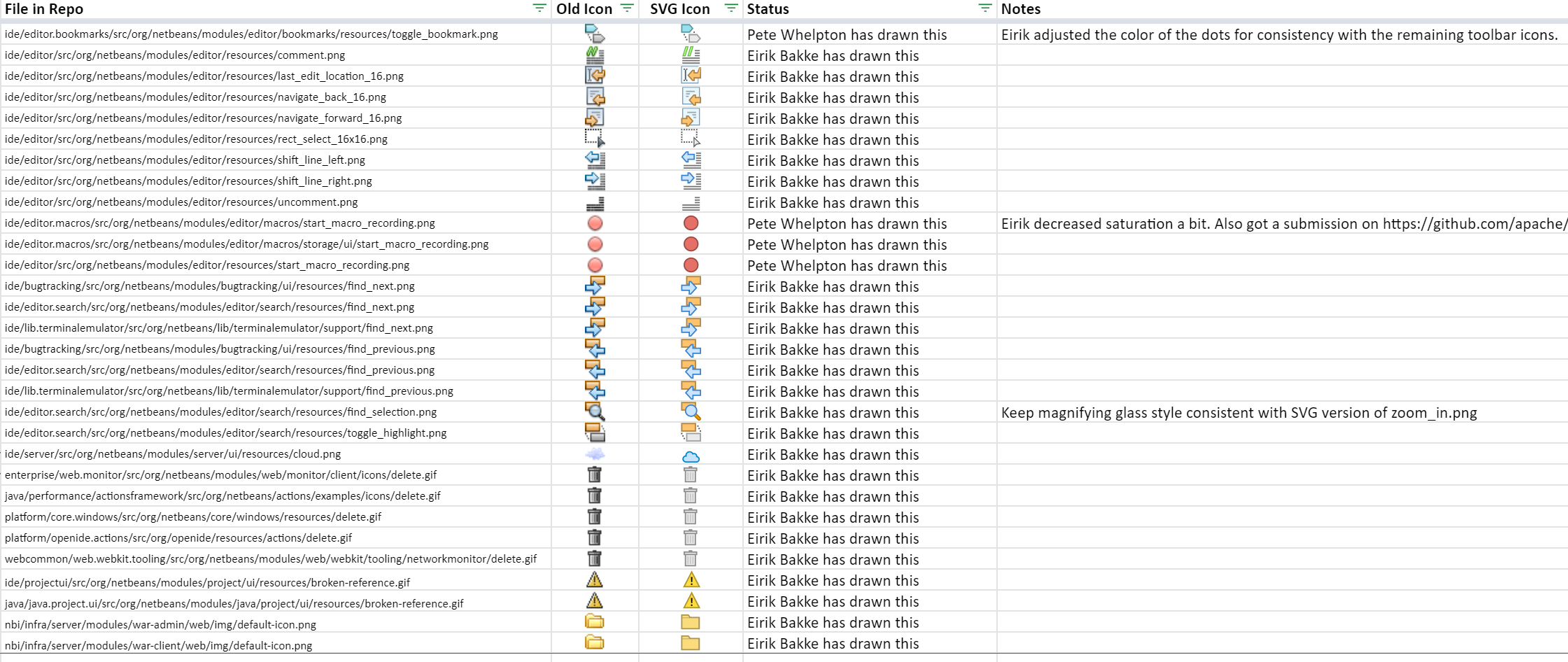 Here are 14 more SVG icons, drawn by myself, covering the remaining ones in the editor toolbar, and a few more locations. The previous SVG icons were added in https://github.com/apache/netbeans/pull/2387 . These icons follow the style guide at https://issues.apache.org/jira/browse/NETBEANS-2617 , like the previously committed icons. The JIRA description for NETBEANS-2617 also describes the process for finding duplicate icons. Whenever the existing bitmap icons (PNG or GIF files) have duplicates, the new SVG icons have been copied into each location, as before. There have been various previous discussions about finding a way to avoid this duplication, but this can be done separately. An overview of the icons converted so far, and the next icons that should be prioritized, can be found here: https://docs.google.com/spreadsheets/d/1U_pj-I3hk9Wj_7lvHcUDsZfFfBSyCkSGqBuv0qt_qXw/edit?usp=sharing Here are the icons specifically affected by this PR:  Will add before/after screenshots of the editor toolbar once my build completes... -- This is an automated message from the Apache Git Service. To respond to the message, please log on to GitHub and use the URL above to go to the specific comment. For queries about this service, please contact Infrastructure at: [email protected] --------------------------------------------------------------------- To unsubscribe, e-mail: [email protected] For additional commands, e-mail: [email protected] For further information about the NetBeans mailing lists, visit: https://cwiki.apache.org/confluence/display/NETBEANS/Mailing+lists