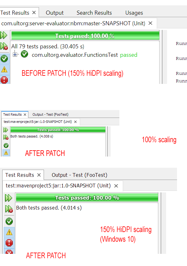 A follow-up on https://github.com/apache/netbeans/pull/3201 which also fixes HiDPI scaling issues in the "Test Results" progress bar. Before/after screenshots:  : -- This is an automated message from the Apache Git Service. To respond to the message, please log on to GitHub and use the URL above to go to the specific comment. To unsubscribe, e-mail: [email protected] For queries about this service, please contact Infrastructure at: [email protected] --------------------------------------------------------------------- To unsubscribe, e-mail: [email protected] For additional commands, e-mail: [email protected] For further information about the NetBeans mailing lists, visit: https://cwiki.apache.org/confluence/display/NETBEANS/Mailing+lists