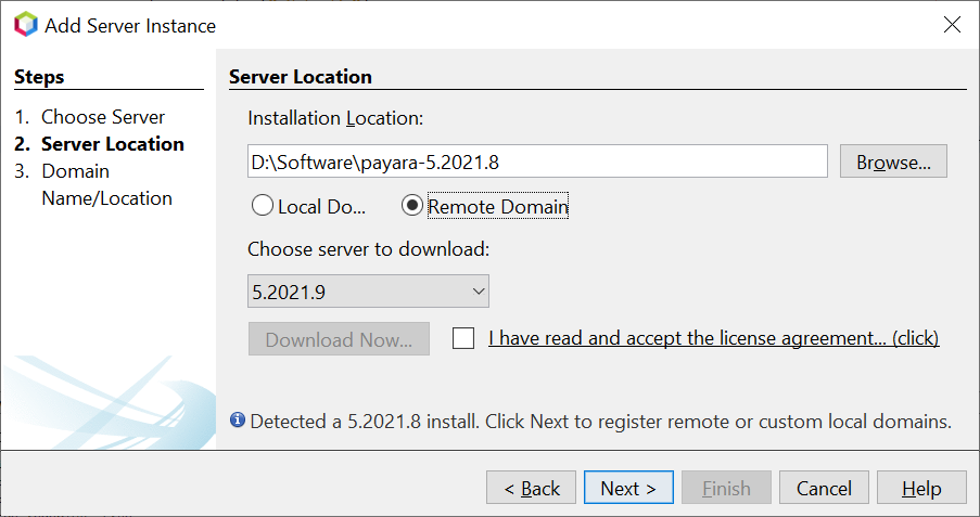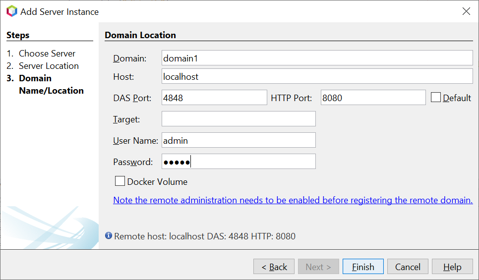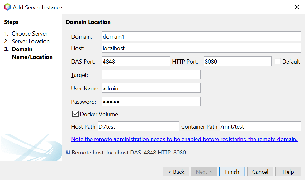 This is a feature PR to support the deployment of the Jakarta application to the Payara Server running in the local docker container. Please follow the below instructions to test the PR: - Open the Apache NetBeans, go to the Services tab, and register a new Payara Server:  - Select the remote domain and browse Payara Server locally installed location of the same version as running in a docker container:  - Enter the domain name, host, and credentials info:  - In the case of docker, select Docker Volume and enter the host path & container path mapping details which is the exploded application path.  - Run the Payara Server docker container: `docker run -p 8080:8080 -p 4848:4848 -p 9009:9009 -v D:/test:/mnt/test payara/server-full:5.2021.8` - Now create the Web Application and deploy the application to the registered Payara Server. -- This is an automated message from the Apache Git Service. To respond to the message, please log on to GitHub and use the URL above to go to the specific comment. To unsubscribe, e-mail: [email protected] For queries about this service, please contact Infrastructure at: [email protected] --------------------------------------------------------------------- To unsubscribe, e-mail: [email protected] For additional commands, e-mail: [email protected] For further information about the NetBeans mailing lists, visit: https://cwiki.apache.org/confluence/display/NETBEANS/Mailing+lists