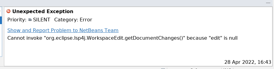 @matthiasblaesing Here is a very simple HTML5/JavaScript project reflecting the example of my first message: [HTML5Application.zip](https://github.com/apache/netbeans/files/8583731/HTML5Application.zip) Here the bulb's menu that I click on:  And here is the exception in the *Notifications* panel:  All my tests have been made with a clean user profile, by deleting the `$HOME/.netbeans/14-rc1` directory (or whichever the version I use in that moment). Thank you. -- This is an automated message from the Apache Git Service. To respond to the message, please log on to GitHub and use the URL above to go to the specific comment. To unsubscribe, e-mail: [email protected] For queries about this service, please contact Infrastructure at: [email protected] --------------------------------------------------------------------- To unsubscribe, e-mail: [email protected] For additional commands, e-mail: [email protected] For further information about the NetBeans mailing lists, visit: https://cwiki.apache.org/confluence/display/NETBEANS/Mailing+lists
