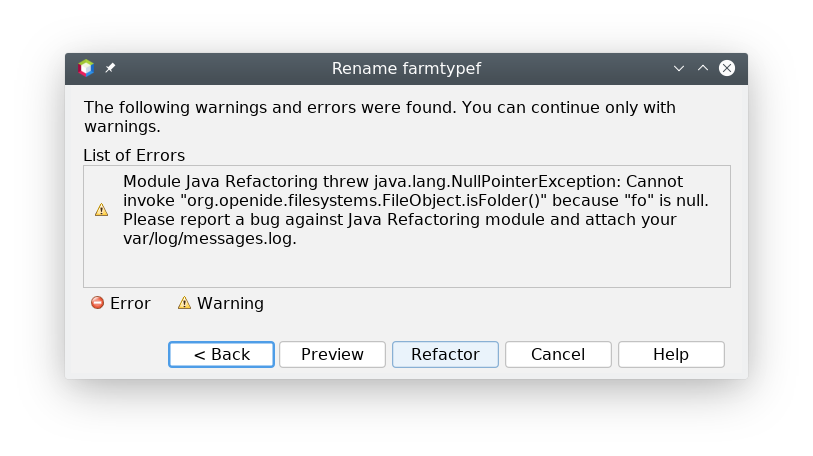 ### Apache NetBeans version Apache NetBeans 15 release candidate ### What happened Before the error occurred, I had renamed (by means of refactoring) lots of packages in my project tree. That actions worked fine until this error came up. Now, I can't rename any package. This is occurring in a Java EE project built with Maven (with multiple modules). Specifically, this is happening in the EJB module. If I try to rename a package in the Web module, it still works OK. Although this time the bug has affected the EJB module, I think that the same error has came up in the Web module in the past (in a similar context: massive renaming). The effects have been the same. This is a screenshot of the modal window that appears:  This is the full exception stack trace: ``` SEVERE [org.openide.util.Exceptions] java.lang.NullPointerException: Cannot invoke "org.openide.filesystems.FileObject.isFolder()" because "fo" is null at org.netbeans.modules.refactoring.java.plugins.MoveFileRefactoringPlugin.getTargetPackageName(MoveFileRefactoringPlugin.java:620) at org.netbeans.modules.refactoring.java.plugins.MoveTransformer.getTargetPackageName(MoveTransformer.java:263) at org.netbeans.modules.refactoring.java.plugins.MoveTransformer.visitImport(MoveTransformer.java:406) at org.netbeans.modules.refactoring.java.plugins.MoveTransformer.visitImport(MoveTransformer.java:47) at com.sun.tools.javac.tree.JCTree$JCImport.accept(JCTree.java:683) at com.sun.source.util.TreePathScanner.scan(TreePathScanner.java:86) at org.netbeans.modules.refactoring.java.spi.RefactoringVisitor.scan(RefactoringVisitor.java:193) at org.netbeans.modules.refactoring.java.spi.RefactoringVisitor.scan(RefactoringVisitor.java:77) at com.sun.source.util.TreeScanner.scanAndReduce(TreeScanner.java:96) at com.sun.source.util.TreeScanner.scan(TreeScanner.java:111) at com.sun.source.util.TreeScanner.scanAndReduce(TreeScanner.java:119) at com.sun.source.util.TreeScanner.visitCompilationUnit(TreeScanner.java:151) at org.netbeans.modules.refactoring.java.plugins.MoveTransformer.visitCompilationUnit(MoveTransformer.java:320) at org.netbeans.modules.refactoring.java.plugins.MoveTransformer.visitCompilationUnit(MoveTransformer.java:47) at com.sun.tools.javac.tree.JCTree$JCCompilationUnit.accept(JCTree.java:614) at com.sun.source.util.TreePathScanner.scan(TreePathScanner.java:86) at org.netbeans.modules.refactoring.java.spi.RefactoringVisitor.scan(RefactoringVisitor.java:193) at org.netbeans.modules.refactoring.java.spi.JavaRefactoringPlugin$TransformTask.run(JavaRefactoringPlugin.java:455) at org.netbeans.modules.refactoring.java.spi.JavaRefactoringPlugin$TransformTask.run(JavaRefactoringPlugin.java:420) at org.netbeans.modules.refactoring.java.spi.JavaRefactoringPlugin.lambda$processFiles$1(JavaRefactoringPlugin.java:325) at org.netbeans.api.java.source.JavaSource$1.run(JavaSource.java:675) at org.netbeans.api.java.source.JavaSource$1.run(JavaSource.java:665) at org.netbeans.api.java.source.JavaSource$MultiTask.run(JavaSource.java:504) at org.netbeans.modules.parsing.impl.TaskProcessor.callUserTask(TaskProcessor.java:586) at org.netbeans.modules.parsing.api.ParserManager$MultiUserTaskAction.run(ParserManager.java:169) at org.netbeans.modules.parsing.api.ParserManager$MultiUserTaskAction.run(ParserManager.java:140) at org.netbeans.modules.parsing.impl.TaskProcessor$2.call(TaskProcessor.java:181) at org.netbeans.modules.parsing.impl.TaskProcessor$2.call(TaskProcessor.java:178) at org.netbeans.modules.masterfs.filebasedfs.utils.FileChangedManager.priorityIO(FileChangedManager.java:153) at org.netbeans.modules.masterfs.providers.ProvidedExtensions.priorityIO(ProvidedExtensions.java:335) at org.netbeans.modules.parsing.nb.DataObjectEnvFactory.runPriorityIO(DataObjectEnvFactory.java:118) at org.netbeans.modules.parsing.impl.Utilities.runPriorityIO(Utilities.java:67) at org.netbeans.modules.parsing.impl.TaskProcessor.runUserTask(TaskProcessor.java:178) at org.netbeans.modules.parsing.api.ParserManager.parse(ParserManager.java:85) at org.netbeans.api.java.source.JavaSource.runUserActionTaskImpl(JavaSource.java:454) at org.netbeans.api.java.source.JavaSource.runUserActionTask(JavaSource.java:425) at org.netbeans.api.java.source.JavaSource.runModificationTask(JavaSource.java:686) at org.netbeans.modules.refactoring.java.spi.JavaRefactoringPlugin.processFiles(JavaRefactoringPlugin.java:323) at org.netbeans.modules.refactoring.java.spi.JavaRefactoringPlugin.processFiles(JavaRefactoringPlugin.java:264) at org.netbeans.modules.refactoring.java.spi.JavaRefactoringPlugin.processFiles(JavaRefactoringPlugin.java:246) at org.netbeans.modules.refactoring.java.spi.JavaRefactoringPlugin.createAndAddElements(JavaRefactoringPlugin.java:338) at org.netbeans.modules.refactoring.java.spi.JavaRefactoringPlugin.createAndAddElements(JavaRefactoringPlugin.java:354) at org.netbeans.modules.refactoring.java.plugins.MoveFileRefactoringPlugin.prepare(MoveFileRefactoringPlugin.java:576) [catch] at org.netbeans.modules.refactoring.api.AbstractRefactoring.pluginsPrepare2(AbstractRefactoring.java:417) at org.netbeans.modules.refactoring.api.AbstractRefactoring.pluginsPrepare(AbstractRefactoring.java:401) at org.netbeans.modules.refactoring.api.AbstractRefactoring.prepare(AbstractRefactoring.java:212) at org.netbeans.modules.refactoring.spi.impl.ParametersPanel$Prepare.run(ParametersPanel.java:1063) at org.openide.util.RequestProcessor$Task.run(RequestProcessor.java:1418) at org.netbeans.modules.openide.util.GlobalLookup.execute(GlobalLookup.java:45) at org.openide.util.lookup.Lookups.executeWith(Lookups.java:278) at org.openide.util.RequestProcessor$Processor.run(RequestProcessor.java:2033) ``` ### How to reproduce I've tried hard but have not been able to reproduce this error yet. I only know that this usually happens when I do a massive renaming of packages and classes. I don't know what triggers it. ### Did this work correctly in an earlier version? Apache NetBeans 12.3 or earlier ### Oper