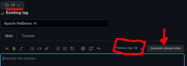 the `release-drafter` action can't generate a "new contributors" category (https://github.com/release-drafter/release-drafter/issues/1001). Since first time contributors have to go through extra steps and show patience, we should try to at least give them credit. This PR removes the `release-drafter` workflow (manual dispatch) and switches back to the default github drafting mechanism. It is less flexible but has hopefully what we need. Added a lot more categories. (anything missing? ignore list sufficient?) What I don't know is if items show up multiple times in multiple categories - I really hope not, otherwise this is going to be "interesting". Docs seem to leave the important parts out. This would have to be merged before testing. It is also possible to edit old releases:  I don't know how to automate this. So we might have to do those few clicks manually on each release. -- This is an automated message from the Apache Git Service. To respond to the message, please log on to GitHub and use the URL above to go to the specific comment. To unsubscribe, e-mail: [email protected] For queries about this service, please contact Infrastructure at: [email protected] --------------------------------------------------------------------- To unsubscribe, e-mail: [email protected] For additional commands, e-mail: [email protected] For further information about the NetBeans mailing lists, visit: https://cwiki.apache.org/confluence/display/NETBEANS/Mailing+lists