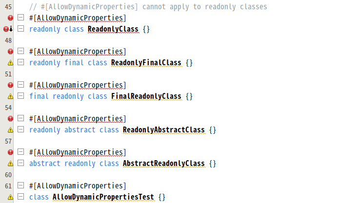 #4725 - https://wiki.php.net/rfc/readonly_classes #### Part 1 - Fix the grammar file - Add `PHP82UnhandledError` - Add/Fix unit tests for the parser, the lexter, and the index #### Part 2 - Fix hints for readonly classes - Add the code template for a readonly class - Add unit tests for hints, formatter, and CC   -- This is an automated message from the Apache Git Service. To respond to the message, please log on to GitHub and use the URL above to go to the specific comment. To unsubscribe, e-mail: [email protected] For queries about this service, please contact Infrastructure at: [email protected] --------------------------------------------------------------------- To unsubscribe, e-mail: [email protected] For additional commands, e-mail: [email protected] For further information about the NetBeans mailing lists, visit: https://cwiki.apache.org/confluence/display/NETBEANS/Mailing+lists