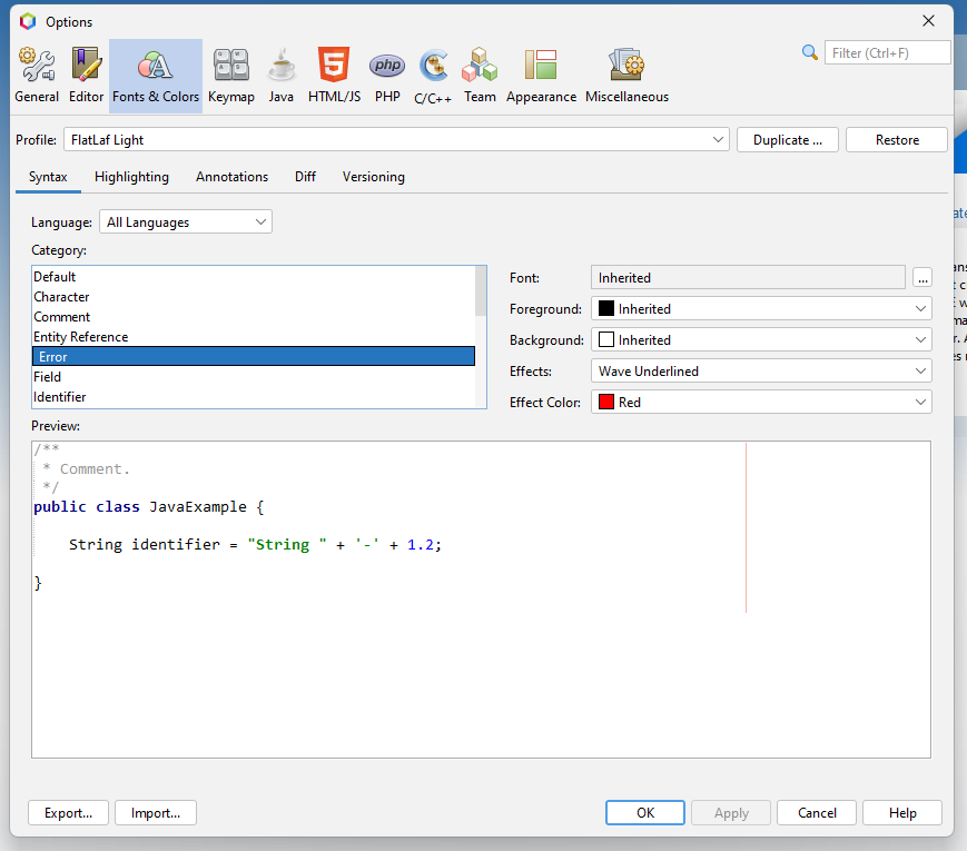 ### Description It is not easy to understand the syntax highlighting I will get at the end because the preview has a super simple example that does not reflect all available categories  ### Use case/motivation Would be nice to have a more complex example that allows an understanding of what result I will get after all my changes. ### Related issues _No response_ ### Are you willing to submit a pull request? No ### Code of Conduct Yes -- This is an automated message from the Apache Git Service. To respond to the message, please log on to GitHub and use the URL above to go to the specific comment. To unsubscribe, e-mail: [email protected] For queries about this service, please contact Infrastructure at: [email protected] --------------------------------------------------------------------- To unsubscribe, e-mail: [email protected] For additional commands, e-mail: [email protected] For further information about the NetBeans mailing lists, visit: https://cwiki.apache.org/confluence/display/NETBEANS/Mailing+lists