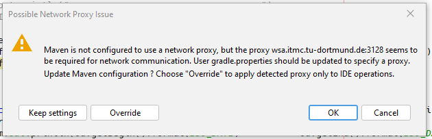 I saw this dialog the first time today:  What is missing IMHO is a guide how to silence this. I had to come here to realize, that he solution is as easy as going to maven settings and setting the proxy selection to "Do not check". Spelling this out for me ("Go to Options -> Java -> Maven -> Execution -> Network proxy to change the default action") would have helped me. -- This is an automated message from the Apache Git Service. To respond to the message, please log on to GitHub and use the URL above to go to the specific comment. To unsubscribe, e-mail: [email protected] For queries about this service, please contact Infrastructure at: [email protected] --------------------------------------------------------------------- To unsubscribe, e-mail: [email protected] For additional commands, e-mail: [email protected] For further information about the NetBeans mailing lists, visit: https://cwiki.apache.org/confluence/display/NETBEANS/Mailing+lists