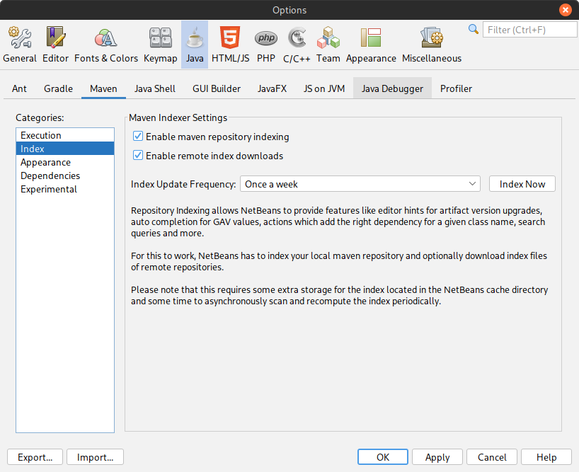 allows to keep local indexing enabled while optionally disabling remote index downloads. updated the settings UI a bit, added a description.  There is a small bug which is probably not worth the trouble of fixing: if the download started, is canceled, and the setting is then disabled again, NB will still think the download did not finish (which is technically true) and show the partial-index or indexing-in-progress notification in auto completion and search forms, restart fixes this. -- This is an automated message from the Apache Git Service. To respond to the message, please log on to GitHub and use the URL above to go to the specific comment. To unsubscribe, e-mail: [email protected] For queries about this service, please contact Infrastructure at: [email protected] --------------------------------------------------------------------- To unsubscribe, e-mail: [email protected] For additional commands, e-mail: [email protected] For further information about the NetBeans mailing lists, visit: https://cwiki.apache.org/confluence/display/NETBEANS/Mailing+lists