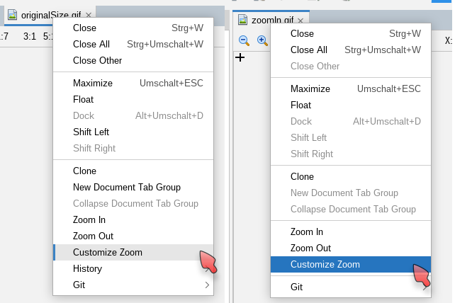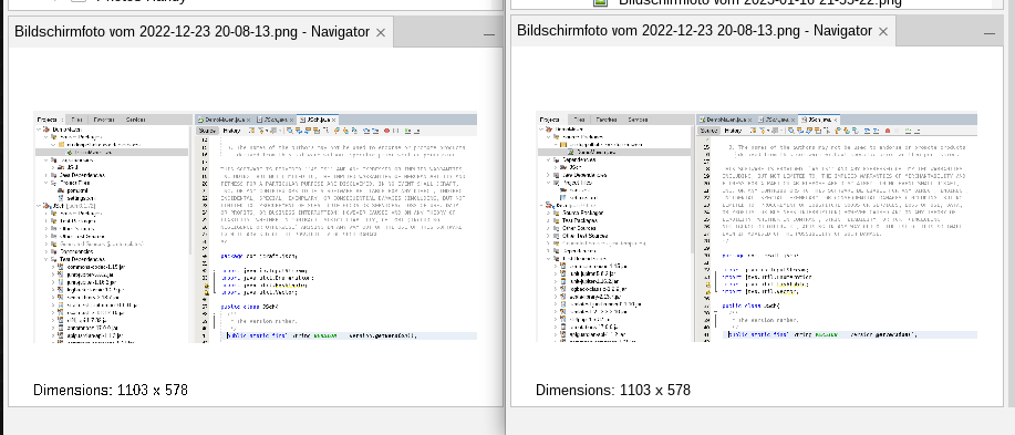 The navigator window is not using antialiasing (left current version, right version from this PR):  When dragging images the cursor and the position on the image drifted apart, this is fixed. In the left part of the screenshot a drag start and end is shown for the original version, while the right side shows the new one (see the locations of the red cross and the red hand):  As part of the warning fixes, the generation of the action list had to be updated and while doing this the order was modified, so that it is more clear (separator before the image actions block and between the image and filesystem actions):  -- This is an automated message from the Apache Git Service. To respond to the message, please log on to GitHub and use the URL above to go to the specific comment. To unsubscribe, e-mail: [email protected] For queries about this service, please contact Infrastructure at: [email protected] --------------------------------------------------------------------- To unsubscribe, e-mail: [email protected] For additional commands, e-mail: [email protected] For further information about the NetBeans mailing lists, visit: https://cwiki.apache.org/confluence/display/NETBEANS/Mailing+lists