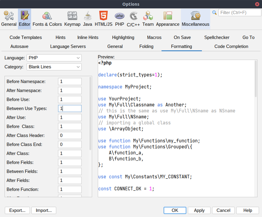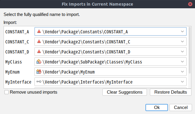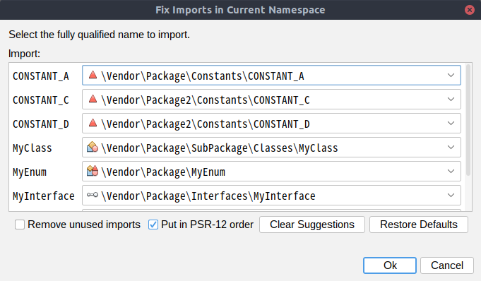 - https://github.com/apache/netbeans/issues/4609 - PSR-12: https://www.php-fig.org/psr/psr-12/#3-declare-statements-namespace-and-import-statements - Fix the formatter - Fix the preview file  - Fix "Fix imports" - Add `FixImportsBottomPanel` as a bottom panel of `FixDuplicateImportsStmts` Example: ```php <?php class TestClass implements MyInterface { use MyTrait; public function test(): void { $a = new MyClass(); CONSTANT_B; } } CONSTANT_A; MyEnum::Case1; functionA(); ``` Inserted (Checked "Put in PSR-12 order"): ```php <?php namespace Test; use Vendor\Package\{ Classes\MyClass, Enums\MyEnum, Interfaces\MyInterface, Traits\MyTrait }; use function Vendor\Package\Functions\functionA; use const Vendor\Package\Constants\{ CONSTANT_A, CONSTANT_B }; class TestClass implements MyInterface { use MyTrait; public function test(): void { $a = new MyClass(); CONSTANT_B; } } CONSTANT_A; MyEnum::Case1; functionA(); ``` Before:  After:  - Don't add a space before `{` - Don't generate full class names in the panel #### NOTE The following is not supported yet. ``` Compound namespaces with a depth of more than two MUST NOT be used. Therefore the following is the maximum compounding depth allowed: ``` ```php <?php use Vendor\Package\SomeNamespace\{ SubnamespaceOne\ClassA, SubnamespaceOne\ClassB, SubnamespaceTwo\ClassY, ClassZ, }; ``` -- This is an automated message from the Apache Git Service. To respond to the message, please log on to GitHub and use the URL above to go to the specific comment. To unsubscribe, e-mail: [email protected] For queries about this service, please contact Infrastructure at: [email protected] --------------------------------------------------------------------- To unsubscribe, e-mail: [email protected] For additional commands, e-mail: [email protected] For further information about the NetBeans mailing lists, visit: https://cwiki.apache.org/confluence/display/NETBEANS/Mailing+lists