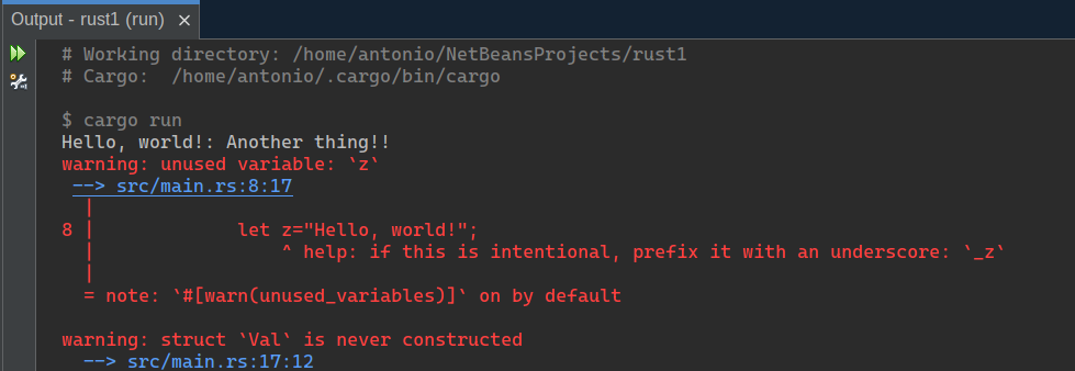 Improvements to the Rust output window: - re-run action - options panel - hyperlinks from error messages to source - working directory and cargo command is shown in grey colors  -- This is an automated message from the Apache Git Service. To respond to the message, please log on to GitHub and use the URL above to go to the specific comment. To unsubscribe, e-mail: [email protected] For queries about this service, please contact Infrastructure at: [email protected] --------------------------------------------------------------------- To unsubscribe, e-mail: [email protected] For additional commands, e-mail: [email protected] For further information about the NetBeans mailing lists, visit: https://cwiki.apache.org/confluence/display/NETBEANS/Mailing+lists