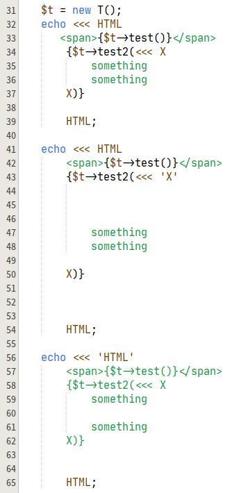 - https://github.com/apache/netbeans/issues/5585 - Fix the lexers - Keep the current heredoc information on the stack when the heredoc is nested Example: ```php <?php class T { public function test(): string { return "test method"; } public function test2($param): string { return $param . PHP_EOL; } } $t = new T(); echo <<< HTML <span>{$t->test()}</span> {$t->test2(<<< X something something X)} HTML; ```  -- This is an automated message from the Apache Git Service. To respond to the message, please log on to GitHub and use the URL above to go to the specific comment. To unsubscribe, e-mail: [email protected] For queries about this service, please contact Infrastructure at: [email protected] --------------------------------------------------------------------- To unsubscribe, e-mail: [email protected] For additional commands, e-mail: [email protected] For further information about the NetBeans mailing lists, visit: https://cwiki.apache.org/confluence/display/NETBEANS/Mailing+lists