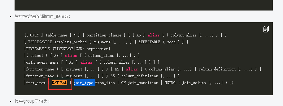 > According to openGauss document——https://docs.opengauss.org/zh/docs/3.0.0/docs/BriefTutorial/JOIN.html, it only support five join type: CROSS JOIN, INNER JOIN, LEFT OUTER JOIN, RIGHT OUTER JOIN and FULL OUTER JOIN. **nature is front of join_type** https://docs.opengauss.org/zh/docs/3.0.0/docs/Developerguide/SELECT.html  -- This is an automated message from the Apache Git Service. To respond to the message, please log on to GitHub and use the URL above to go to the specific comment. To unsubscribe, e-mail: [email protected] For queries about this service, please contact Infrastructure at: [email protected]