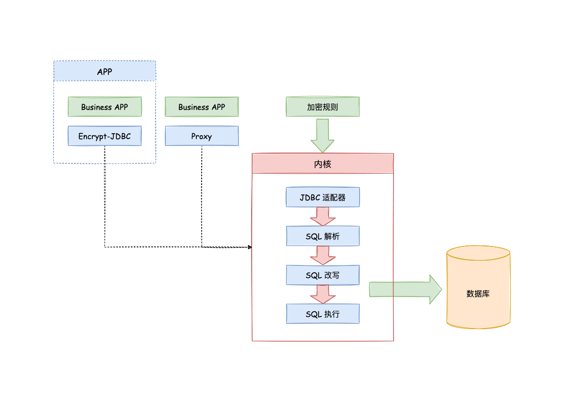 行为,再依据用户传入的加密规则,找出需要加密的字段和所使用的加解密算法对目标字段进行加解密处理后,再与底层数据库进行交互。
