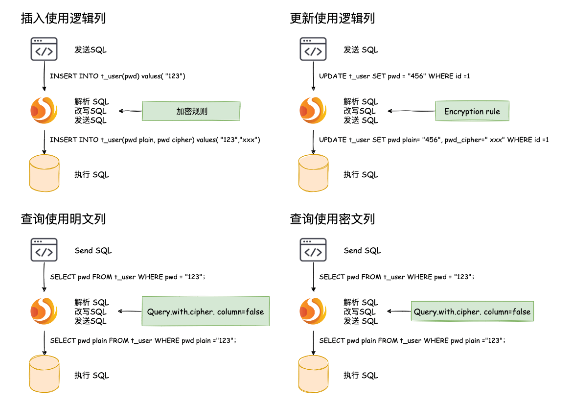 Apache ShardingSphere 会将用户请求的明文进行加密后存储到底层数据库;并在用户查询时,将密文从数据库中取出进行解密后返回给终端用户。