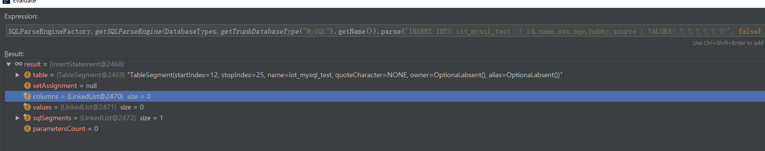 lyllove opened a new issue #4546: SQLParseEngine can not get columns when sql columns has 'source' name key URL: https://github.com/apache/incubator-shardingsphere/issues/4546 SQLParseEngineFactory.getSQLParseEngine(DatabaseTypes.getTrunkDatabaseType("MySQL").getName()).parse("INSERT INTO iot_mysql_test ( id,name,sex,age,hobby,source ) VALUES( ?,?,?,?,?,?)", false)