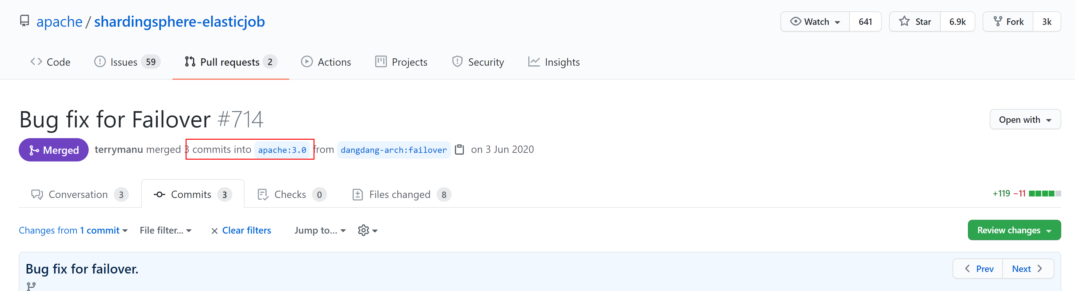 ## Question **For English only**, other languages will not accept. Before asking a question, make sure you have: - Googled your question. - Searched open and closed [GitHub issues](https://github.com/apache/shardingsphere-elasticjob/issues). - Read documentation: [ElasticJob Doc](https://shardingsphere.apache.org/elasticjob/current/en/overview/). Please pay attention on issues you submitted, because we maybe need more details. If no response anymore and we cannot reproduce it on current information, we will **close it**.  Hi,Bug fix for Failover #714 merged into apache:3.0 branch,but I can't find the apache:3.0 branch And I can't find the code from Bug fix for Failover #714 in the master branch. So, I'd like to find which branch includes the code from Bug fix for Failover #714, thx~ -- This is an automated message from the Apache Git Service. To respond to the message, please log on to GitHub and use the URL above to go to the specific comment. For queries about this service, please contact Infrastructure at: [email protected]