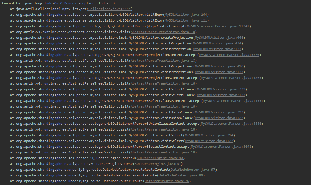 my mysql table :  CREATE TABLE `t_testpaper_question` ( `id` bigint(20) unsigned NOT NULL, `paperId` bigint(20) DEFAULT NULL, `questionId` bigint(20) NOT NULL, `innerOrder` int(11) DEFAULT NULL, `status` int(11) NOT NULL DEFAULT '1' COMMENT '0禁用,1启用', PRIMARY KEY (`id`), KEY `tq_paperId` (`paperId`), KEY `t_testpaper_question_questionId_index` (`questionId`) ) ENGINE=InnoDB DEFAULT CHARSET=utf8 ROW_FORMAT=DYNAMIC pom version:  When I use spring boot excute sql : "SELECT ttq.*,(@rowNum :=@rowNum + 1) AS num FROM t_testpaper_question ttq,(SELECT @rowNum := 0) temp WHERE paperId = 160 AND STATUS = 1 ORDER BY innerOrder",my idea throw IndexOutOfBoundsException. The following is idea console info: 2021-07-05 18:11:13.889 ERROR 15476 --- [ XNIO-1 task-1] c.q.p.qlib.exception.ExcptionAdvice : occur unhandle exception: org.mybatis.spring.MyBatisSystemException, errorMsg: nested exception is org.apache.ibatis.exceptions.PersistenceException: ### Error querying database. Cause: java.lang.IndexOutOfBoundsException: Index: 0 ### The error may exist in file [D:\webroot\onesmart-qlib-service\target\classes\mapper\TestPaperMapper.xml] ### The error may involve defaultParameterMap ### The error occurred while setting parameters ### SQL: select ttq.*,(@rowNum :=@rowNum + 1) AS num from t_testpaper_question ttq,(SELECT @rowNum := 0) temp where paperId = ? and status = 1 order by innerOrder ### Cause: java.lang.IndexOutOfBoundsException: Index: 0  -- This is an automated message from the Apache Git Service. To respond to the message, please log on to GitHub and use the URL above to go to the specific comment. To unsubscribe, e-mail: [email protected] For queries about this service, please contact Infrastructure at: [email protected]