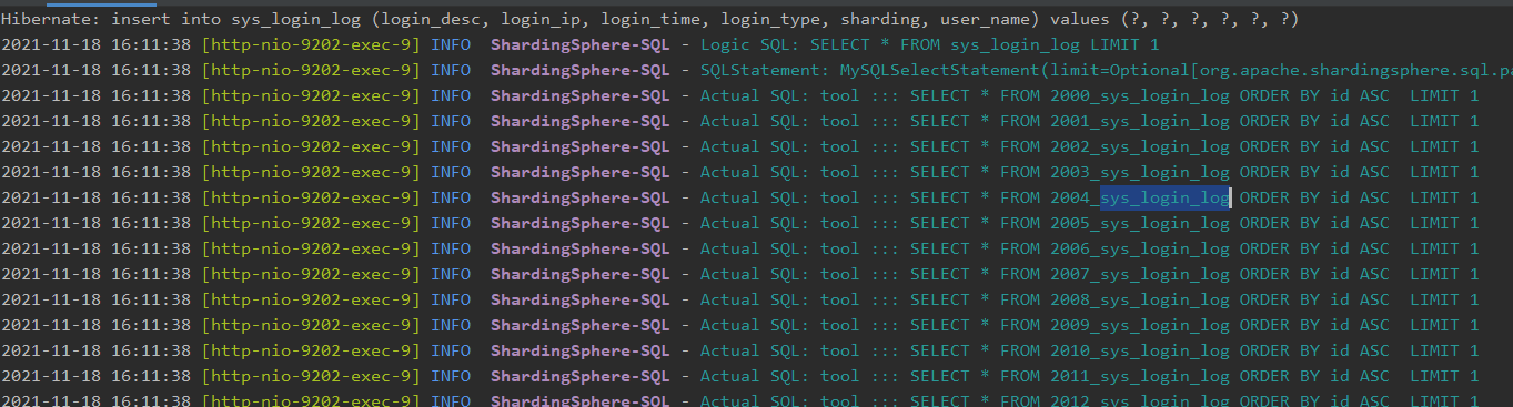the config is ok,entry doSharding method 。 but my project Dynamic table creation,Create a table when me need it , now insert 2021_sys_login_log,the table is created,but the log is printed as follows  Because those tables have not been created (according to other business),so report errors: 2021-11-18 16:20:40 [http-nio-9202-exec-4] ERROR io.seata.rm.datasource.sql.struct.cache.AbstractTableMetaCache - get table meta of the table `sys_login_log` error: Table 'financialcloud-tool.2000_sys_login_log' doesn't exist java.sql.SQLSyntaxErrorException: Table 'financialcloud-tool.2000_sys_login_log' doesn't exist at com.mysql.cj.jdbc.exceptions.SQLError.createSQLException(SQLError.java:120) at com.mysql.cj.jdbc.exceptions.SQLExceptionsMapping.translateException(SQLExceptionsMapping.java:122) at com.mysql.cj.jdbc.StatementImpl.executeQuery(StatementImpl.java:1202) at com.alibaba.druid.pool.DruidPooledStatement.executeQuery(DruidPooledStatement.java:296) at org.apache.shardingsphere.driver.executor.callback.impl.StatementExecuteQueryCallback.executeQuery(StatementExecuteQueryCallback.java:39) at org.apache.shardingsphere.driver.executor.callback.ExecuteQueryCallback.executeSQL(ExecuteQueryCallback.java:44) at org.apache.shardingsphere.driver.executor.callback.ExecuteQueryCallback.executeSQL(ExecuteQueryCallback.java:36) at org.apache.shardingsphere.infra.executor.sql.execute.engine.driver.jdbc.JDBCExecutorCallback.execute(JDBCExecutorCallback.java:85) at org.apache.shardingsphere.infra.executor.sql.execute.engine.driver.jdbc.JDBCExecutorCallback.execute(JDBCExecutorCallback.java:64) at org.apache.shardingsphere.infra.executor.kernel.ExecutorEngine.syncExecute(ExecutorEngine.java:101) at org.apache.shardingsphere.infra.executor.kernel.ExecutorEngine.serialExecute(ExecutorEngine.java:87) at org.apache.shardingsphere.infra.executor.kernel.ExecutorEngine.execute(ExecutorEngine.java:81) at org.apache.shardingsphere.infra.executor.sql.execute.engine.driver.jdbc.JDBCExecutor.execute(JDBCExecutor.java:65) at org.apache.shardingsphere.infra.executor.sql.execute.engine.driver.jdbc.JDBCExecutor.execute(JDBCExecutor.java:49) at org.apache.shardingsphere.driver.executor.DriverJDBCExecutor.executeQuery(DriverJDBCExecutor.java:73) at org.apache.shardingsphere.driver.jdbc.core.statement.ShardingSphereStatement.executeQuery0(ShardingSphereStatement.java:163) at org.apache.shardingsphere.driver.jdbc.core.statement.ShardingSphereStatement.executeQuery(ShardingSphereStatement.java:136) at io.seata.rm.datasource.sql.struct.cache.MysqlTableMetaCache.fetchSchema(MysqlTableMetaCache.java:81) at io.seata.rm.datasource.sql.struct.cache.AbstractTableMetaCache.lambda$getTableMeta$0(AbstractTableMetaCache.java:61) at com.github.benmanes.caffeine.cache.BoundedLocalCache.lambda$doComputeIfAbsent$14(BoundedLocalCache.java:2413) at java.util.concurrent.ConcurrentHashMap.compute(ConcurrentHashMap.java:1853) at com.github.benmanes.caffeine.cache.BoundedLocalCache.doComputeIfAbsent(BoundedLocalCache.java:2411) at com.github.benmanes.caffeine.cache.BoundedLocalCache.computeIfAbsent(BoundedLocalCache.java:2394) at com.github.benmanes.caffeine.cache.LocalCache.computeIfAbsent(LocalCache.java:108) at com.github.benmanes.caffeine.cache.LocalManualCache.get(LocalManualCache.java:62) at io.seata.rm.datasource.sql.struct.cache.AbstractTableMetaCache.getTableMeta(AbstractTableMetaCache.java:59) at io.seata.rm.datasource.exec.BaseTransactionalExecutor.getTableMeta(BaseTransactionalExecutor.java:215) at io.seata.rm.datasource.exec.BaseTransactionalExecutor.getTableMeta(BaseTransactionalExecutor.java:200) at io.seata.rm.datasource.exec.BaseInsertExecutor.beforeImage(BaseInsertExecutor.java:71) at io.seata.rm.datasource.exec.AbstractDMLBaseExecutor.executeAutoCommitFalse(AbstractDMLBaseExecutor.java:99) at io.seata.rm.datasource.exec.AbstractDMLBaseExecutor.doExecute(AbstractDMLBaseExecutor.java:84) at io.seata.rm.datasource.exec.BaseTransactionalExecutor.execute(BaseTransactionalExecutor.java:113) at io.seata.rm.datasource.exec.ExecuteTemplate.execute(ExecuteTemplate.java:111) at io.seata.rm.datasource.exec.ExecuteTemplate.execute(ExecuteTemplate.java:50) at io.seata.rm.datasource.PreparedStatementProxy.executeUpdate(PreparedStatementProxy.java:65) at org.hibernate.engine.jdbc.internal.ResultSetReturnImpl.executeUpdate(ResultSetReturnImpl.java:197) at org.hibernate.dialect.identity.GetGeneratedKeysDelegate.executeAndExtract(GetGeneratedKeysDelegate.java:57) at org.hibernate.id.insert.AbstractReturningDelegate.performInsert(AbstractReturningDelegate.java:43) at org.hibernate.persister.entity.AbstractEntityPersister.insert(AbstractEntityPersister.java:3196) at org.hibernate.persister.entity.AbstractEntityPersister.insert(AbstractEntityPersister.java:3802) at org.hibernate.action.internal.EntityIdentityInsertAction.execute(EntityIdentityInsertAction.java:84) at org.hibernate.engine.spi.ActionQueue.execute(ActionQueue.java:645) at org.hibernate.engine.spi.ActionQueue.addResolvedEntityInsertAction(ActionQueue.java:282) at org.hibernate.engine.spi.ActionQueue.addInsertAction(ActionQueue.java:263) at org.hibernate.engine.spi.ActionQueue.addAction(ActionQueue.java:317) at org.hibernate.event.internal.AbstractSaveEventListener.addInsertAction(AbstractSaveEventListener.java:330) at org.hibernate.event.internal.AbstractSaveEventListener.performSaveOrReplicate(AbstractSaveEventListener.java:287) at org.hibernate.event.internal.AbstractSaveEventListener.performSave(AbstractSaveEventListener.java:193) at org.hibernate.event.internal.AbstractSaveEventListener.saveWithGeneratedId(AbstractSaveEventListener.java:123) at org.hibernate.event.internal.DefaultPersistEventListener.entityIsTransient(DefaultPersistEventListener.java:185) at org.hibernate.event.internal.DefaultPersistEventListener.onPersist(DefaultPersistEventListener.java:128) at org.hibernate.event.internal.DefaultPersistEventListener.onPersist(DefaultPersistEventListener.java:55) at org.hibernate.ev