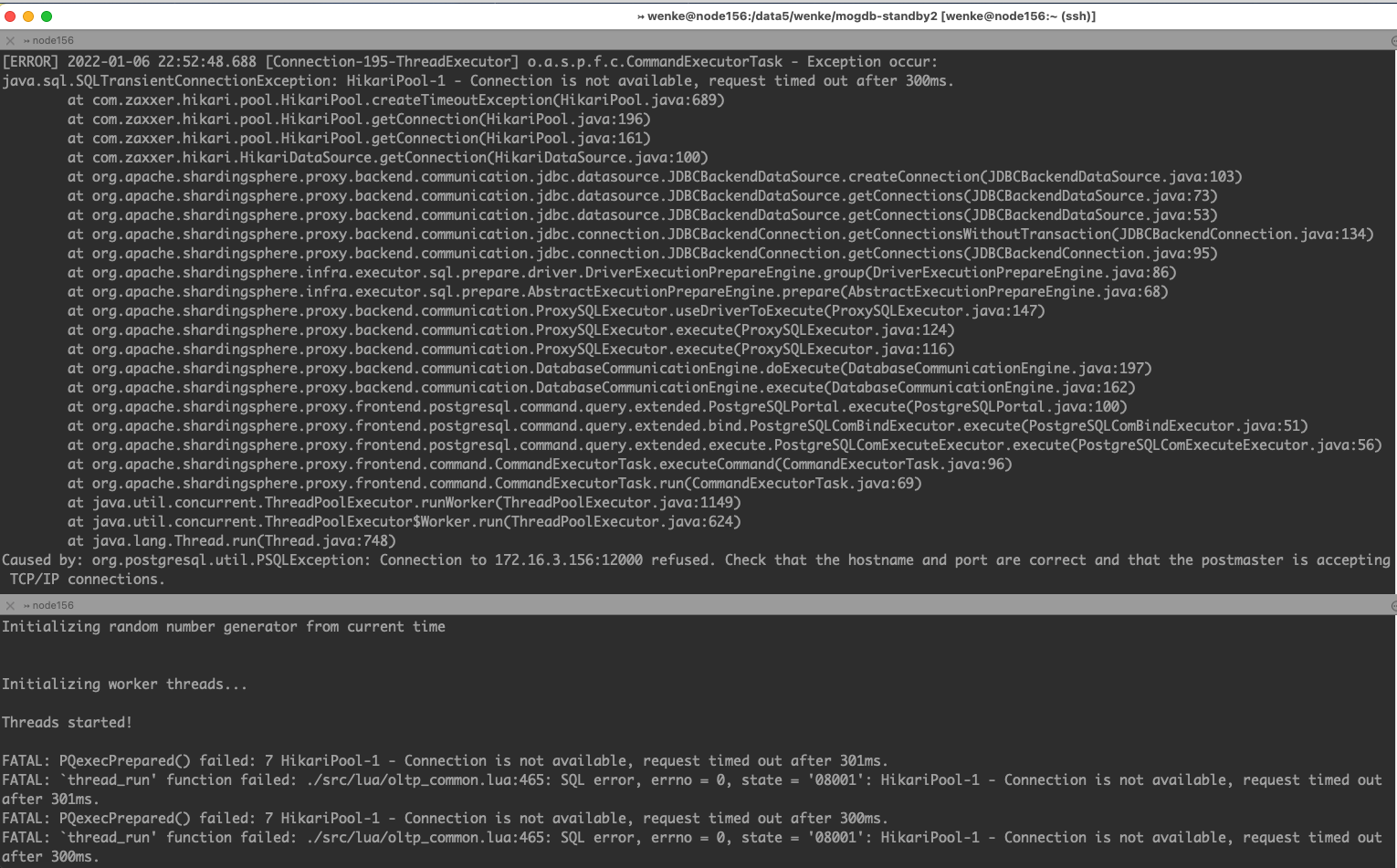 ## Bug Report ### Which version of ShardingSphere did you use? - ShardingSphere 5.1.0 ### Which project did you use? ShardingSphere-JDBC or ShardingSphere-Proxy? - ShardingSphere-Proxy ### Background environment When using MogDB_v2.1.0.3 (same as openGauss 2.1.0) to set up one primary database, two standby databases and using switchover or failover on one of the standby database. After switchover or failover, the current standby database is switched to primary as the new primary database. The original primary database is switched as a standby database. ### Expected behavior ShardingSphere proxy's discovery module should recognise the new primary database and continue with new primary and standby databases. ### Actual behavior ShardingSphere proxy's discovery module does not recognise the change of new primary database - For switchover, ShardingSphere proxy has error: An exception occurred while find primary data source url. When trying to connect and execute sql DDL commands, ShardingSphere proxy has error:cannot execute UPDATE in a read-only transaction. - For failover, ShardingSphere proxy has error: Connection is not available. The error log keeps trying to connect to the old primary database and cause the connection fail ### Reason analyze (If you can) ShardingSphere proxy's discovery module does not recognise the change of new primary database. ### Steps to reproduce the behavior, such as: SQL to execute, sharding rule configuration, when exception occur etc. 1. environment: - MogDB_v2.1.0.3 (release_MogDB_openEuler_ARM64 和 release_MogDB_CentOS_x86) - Zookeeper 3.7.0 - ShardingSphere 5.1.0 - sysbench: https://github.com/akopytov/sysbench/tree/master/src 2. set up 1 primary, 2 standby databases according to mogdb docs 3. start zookeeper and sharding sphere proxy ``` [wenke@node156 wenke]$ cat apache-shardingsphere-5.1.0-shardingsphere-proxy-bin/conf/config-db-discovery.yaml schemaName: rwsplit_test_db dataSources: replica_ds_0: url: jdbc:postgresql://172.16.3.156:12000/postgres?serverTimezone=UTC&useSSL=false username: test1 password: Qwer1234 connectionTimeoutMilliseconds: 300 idleTimeoutMilliseconds: 600 maxLifetimeMilliseconds: 1200 maxPoolSize: 1000 minPoolSize: 200 replica_ds_1: url: jdbc:postgresql://172.16.3.156:13000/postgres?serverTimezone=UTC&useSSL=false username: test1 password: Qwer1234 connectionTimeoutMilliseconds: 300 idleTimeoutMilliseconds: 600 maxLifetimeMilliseconds: 1200 maxPoolSize: 1000 minPoolSize: 200 replica_ds_2: url: jdbc:postgresql://172.16.3.156:14000/postgres?serverTimezone=UTC&useSSL=false username: test1 password: Qwer1234 connectionTimeoutMilliseconds: 300 idleTimeoutMilliseconds: 600 maxLifetimeMilliseconds: 1200 maxPoolSize: 1000 minPoolSize: 200 rules: - !READWRITE_SPLITTING dataSources: rd_rs: autoAwareDataSourceName: pr_ds - !DB_DISCOVERY dataSources: pr_ds: dataSourceNames: - replica_ds_0 - replica_ds_1 - replica_ds_2 discoveryHeartbeatName: og-heartbeat discoveryTypeName: og discoveryHeartbeats: og-heartbeat: props: keep-alive-cron: '0/5 * * * * ?' discoveryTypes: og: type: openGauss props: group-name: 92504d5b-6dec-11e8-91ea-246e9612aaf1 ``` 4. sysbench command executed: ``` sysbench oltp_read_write --db-driver=pgsql --pgsql-host=localhost --pgsql-port=3307 --pgsql-user=test1 --pgsql-password=Qwer1234 --pgsql-db=rwsplit_test_db --skip_trx --tables=10 --table-size=1000000 --threads=64 --report-interval=1 --time=1800 run ``` 5. execute switchover or failover 5.1 switchover ``` [standby1]$ bin/gs_ctl -D data_dir switchover ``` ss switchover error screenshots:   5.2 failover ``` [primary]$ bin/gs_ctl -D data_dir stop [standby1]$ bin/gs_ctl -D data_dir failover ``` ss failover error screenshots:  -- This is an automated message from the Apache Git Service. To respond to the message, please log on to GitHub and use the URL above to go to the specific comment. To unsubscribe, e-mail: [email protected] For queries about this service, please contact Infrastructure at: [email protected]