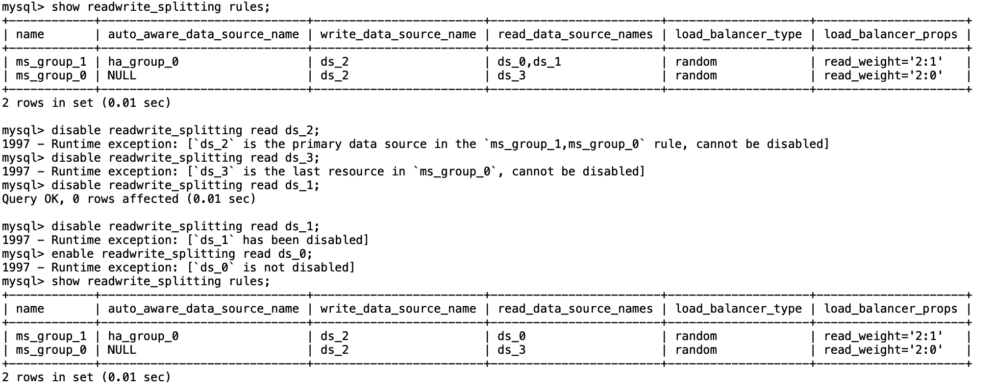 Fixed https://github.com/apache/shardingsphere/issues/14503. Changes proposed in this pull request: - Add check for resource in set readwrite splitting read resource syntax - Fix the show readwrite splitting rules syntax to display static configuration, the disabled database is not removed  -- This is an automated message from the Apache Git Service. To respond to the message, please log on to GitHub and use the URL above to go to the specific comment. To unsubscribe, e-mail: [email protected] For queries about this service, please contact Infrastructure at: [email protected]