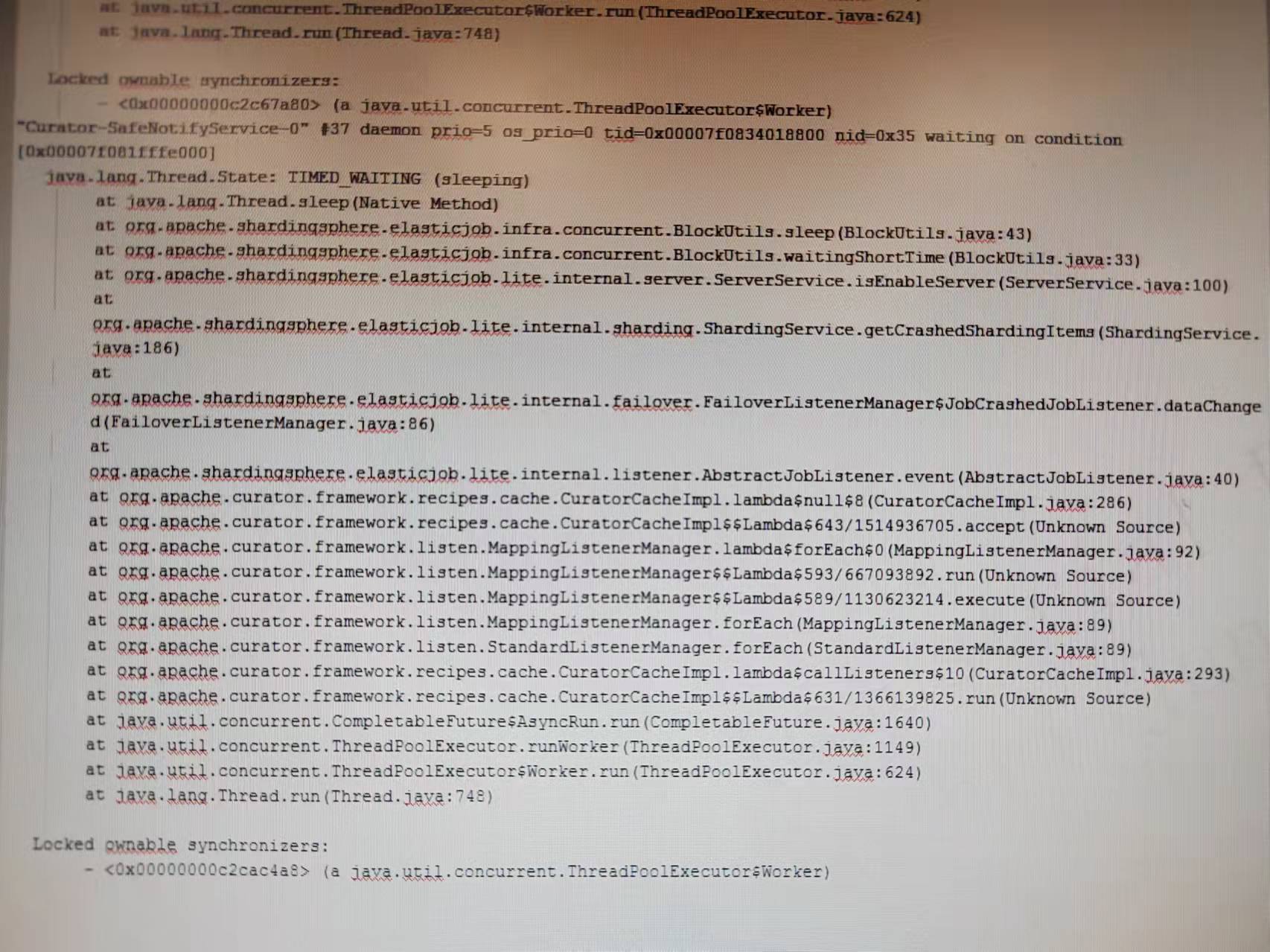 The issue sometimes looks like: when we triggered the job, no shard was triggered at all. The dump file:  From the zookeeper data we can see that the resharding necessary flag was set and the leader was elected, but the leader didn’t do resharding. The leader instance has many debug logs:  The ip server node is a server that have been deleted by us. We deleted the node and this is the cause of the issue, I will discuss of the reason why we delete the server node later. The follower instances have many debug logs:  With the debug logs, we can infer that the leader didn’t do resharding. So I dumped the leader’s stack:  I found that the "Curator-SafeNotifyService-0" thread always stuck here, falling into endless loop at ServerService.isEnableServer(): public boolean isEnableServer(final String ip) { String serverStatus = jobNodeStorage.getJobNodeData(serverNode.getServerNode(ip)); **//Endless loop happend! while (Strings.isNullOrEmpty(serverStatus)) { BlockUtils.waitingShortTime(); serverStatus = jobNodeStorage.getJobNodeData(serverNode.getServerNode(ip)); }** return !ServerStatus.DISABLED.name().equals(serverStatus); } Reason found: It's because our application was runing on cloud-native architechture, and we found that the servers node's children become more and more with the container(pod) being destroyed and created again and again. So I registered a shutdownHook when the container is created, which would remove the instance's server node under servers node from zookeeper when the container is destroyed by calling JobOperateAPI's remove method. It caused this issue because when container was destroyed, the instance gone down and JobCrashedJobListener will be triggered, and the listener will fall into the endless loop as mentioned above if the instance’s server node was deleted. All shards would not be triggered if the leader node‘s "Curator-SafeNotifyService-0" thread fall into the endless loop because only the leader node can do resharding, and all the listeners are triggered by the same thread(**This maybe another issue.**). But if the leader node didn’t fall into the endless loop, resharding will success and we would see that some shards are trigged successfully but those whose instance fell into the endless loop are not, just like the issue. But we do need to solve the problem of server nodes becoming more and more under servers node, so before delete the server node, we sleep some time longer than sessionTimeout to ensure that all the alive instances have finished JobCrashedJobListener to avoid "Curator-SafeNotifyService-0" thread falling into the endless loop. And I’m not sure if we can call addListener(listener, executor) instead of addListener(listener) to register listeners in JobNodeStorage’s addDataListener method to solve "**may be another issue**" metioned above. public void addDataListener(final CuratorCacheListener listener) { CuratorCache cache = (CuratorCache) regCenter.getRawCache("/" + jobName); **//Maybe we can call addListener(listener, executor) instead of addListener(listener) at here? cache.listenable().addListener(listener);** } -- This is an automated message from the Apache Git Service. To respond to the message, please log on to GitHub and use the URL above to go to the specific comment. To unsubscribe, e-mail: [email protected] For queries about this service, please contact Infrastructure at: [email protected]