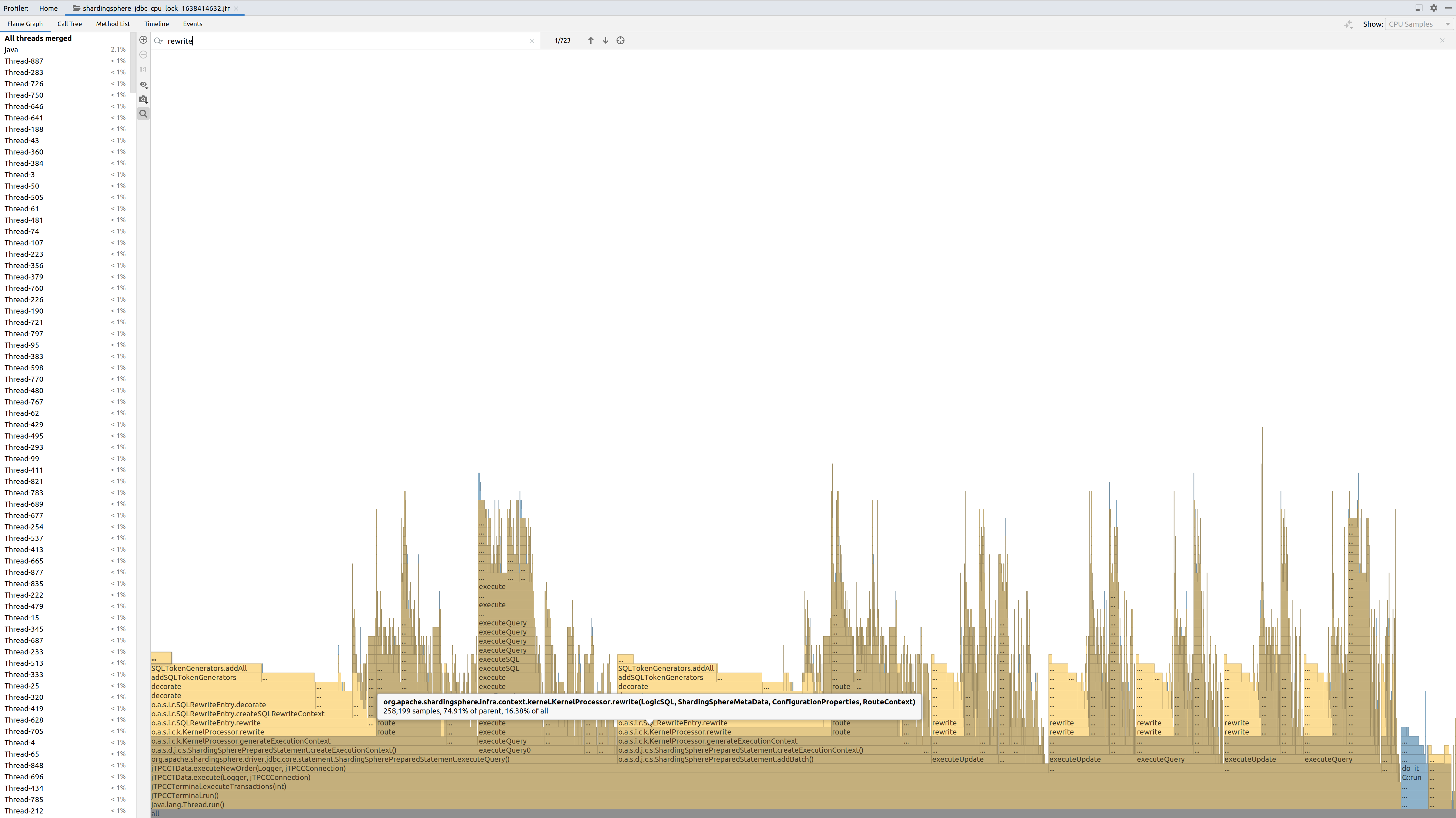 ## Performance Issue ### Which version of ShardingSphere did you use? ShardingSphere master 753995d257d5803cc61e4abda2870978f506c3af ### Which project did you use? ShardingSphere-JDBC or ShardingSphere-Proxy? ShardingSphere JDBC ## Environments - 128 cores (aarch64) running BenchmarkSQL + ShardingSphere JDBC - 128 cores (aarch64) openGauss - 128 cores (aarch64) openGauss - 128 cores (aarch64) openGauss While benching, the CPU usage of the BenchmarkSQL + ShardingSphere JDBC is about 12000%. But the average CPU usage of databases are 30~50%. ## JFR Extract the following zip and open with JFR or IntelliJ IDEA with ShardingSphere project. [shardingsphere_jdbc_cpu_lock_1638414632.zip](https://github.com/apache/shardingsphere/files/7638806/shardingsphere_jdbc_cpu_lock_1638414632.zip) There are about **47% samples are SQL rewriting**:  ## Configurations ```yaml dataSources: ds_0: dataSourceClassName: com.zaxxer.hikari.HikariDataSource driverClassName: org.opengauss.Driver jdbcUrl: jdbc:opengauss://og0:14000/test?loggerLevel=OFF username: username password: password maximumPoolSize: 4096 minimumIdle: 400 ds_1: dataSourceClassName: com.zaxxer.hikari.HikariDataSource driverClassName: org.opengauss.Driver jdbcUrl: jdbc:opengauss://og1:14000/test?loggerLevel=OFF username: username password: password maximumPoolSize: 4096 minimumIdle: 400 ds_2: dataSourceClassName: com.zaxxer.hikari.HikariDataSource driverClassName: org.opengauss.Driver jdbcUrl: jdbc:opengauss://og2:14000/test?loggerLevel=OFF username: username password: password maximumPoolSize: 4096 minimumIdle: 400 rules: - !SHARDING bindingTables: - bmsql_warehouse, bmsql_customer - bmsql_stock, bmsql_district, bmsql_order_line broadcastTables: - bmsql_item defaultDatabaseStrategy: standard: shardingAlgorithmName: database_inline shardingColumn: ds_id defaultTableStrategy: none: null shardingAlgorithms: ds_bmsql_config_inline: props: algorithm-expression: ds_${cfg_id % 3} type: INLINE ds_bmsql_customer_inline: props: algorithm-expression: ds_${c_w_id % 3} type: INLINE ds_bmsql_district_inline: props: algorithm-expression: ds_${d_w_id % 3} type: INLINE ds_bmsql_history_inline: props: algorithm-expression: ds_${h_w_id % 3} type: INLINE ds_bmsql_new_order_inline: props: algorithm-expression: ds_${no_w_id % 3} type: INLINE ds_bmsql_oorder_inline: props: algorithm-expression: ds_${o_w_id % 3} type: INLINE ds_bmsql_order_line_inline: props: algorithm-expression: ds_${ol_w_id % 3} type: INLINE ds_bmsql_stock_inline: props: algorithm-expression: ds_${s_w_id % 3} type: INLINE ds_bmsql_warehouse_inline: props: algorithm-expression: ds_${w_id % 3} type: INLINE tables: bmsql_config: actualDataNodes: ds_${0..2}.bmsql_config databaseStrategy: standard: shardingAlgorithmName: ds_bmsql_config_inline shardingColumn: cfg_id bmsql_customer: actualDataNodes: ds_${0..2}.bmsql_customer databaseStrategy: standard: shardingAlgorithmName: ds_bmsql_customer_inline shardingColumn: c_w_id bmsql_district: actualDataNodes: ds_${0..2}.bmsql_district databaseStrategy: standard: shardingAlgorithmName: ds_bmsql_district_inline shardingColumn: d_w_id bmsql_history: actualDataNodes: ds_${0..2}.bmsql_history databaseStrategy: standard: shardingAlgorithmName: ds_bmsql_history_inline shardingColumn: h_w_id bmsql_new_order: actualDataNodes: ds_${0..2}.bmsql_new_order databaseStrategy: standard: shardingAlgorithmName: ds_bmsql_new_order_inline shardingColumn: no_w_id bmsql_oorder: actualDataNodes: ds_${0..2}.bmsql_oorder databaseStrategy: standard: shardingAlgorithmName: ds_bmsql_oorder_inline shardingColumn: o_w_id bmsql_order_line: actualDataNodes: ds_${0..2}.bmsql_order_line databaseStrategy: standard: shardingAlgorithmName: ds_bmsql_order_line_inline shardingColumn: ol_w_id bmsql_stock: actualDataNodes: ds_${0..2}.bmsql_stock databaseStrategy: standard: shardingAlgorithmName: ds_bmsql_stock_inline shardingColumn: s_w_id bmsql_warehouse: actualDataNodes: ds_${0..2}.bmsql_warehouse databaseStrategy: standard: shardingAlgorithmName: ds_bmsql_warehouse_inline shardingColumn: w_id schemaName: sharding_db props: max-connections-size-per-query: 10 ``` -- This is an automated message from the Apache Git Service. To respond to the message, please log on to GitHub and use the URL above to go to the specific comment. To unsubscribe, e-mail: [email protected] For queries about this service, please contact Infrastructure at: [email protected]