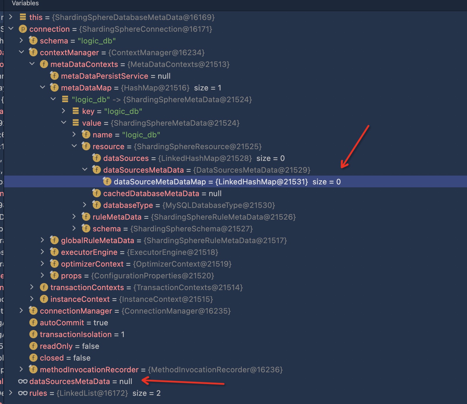 In class org.apache.shardingsphere.driver.jdbc.core.datasource.metadata.ShardingSphereDatabaseMetaData line 57, the dataSourcesMetaData was null.  -- This is an automated message from the Apache Git Service. To respond to the message, please log on to GitHub and use the URL above to go to the specific comment. To unsubscribe, e-mail: [email protected] For queries about this service, please contact Infrastructure at: [email protected]